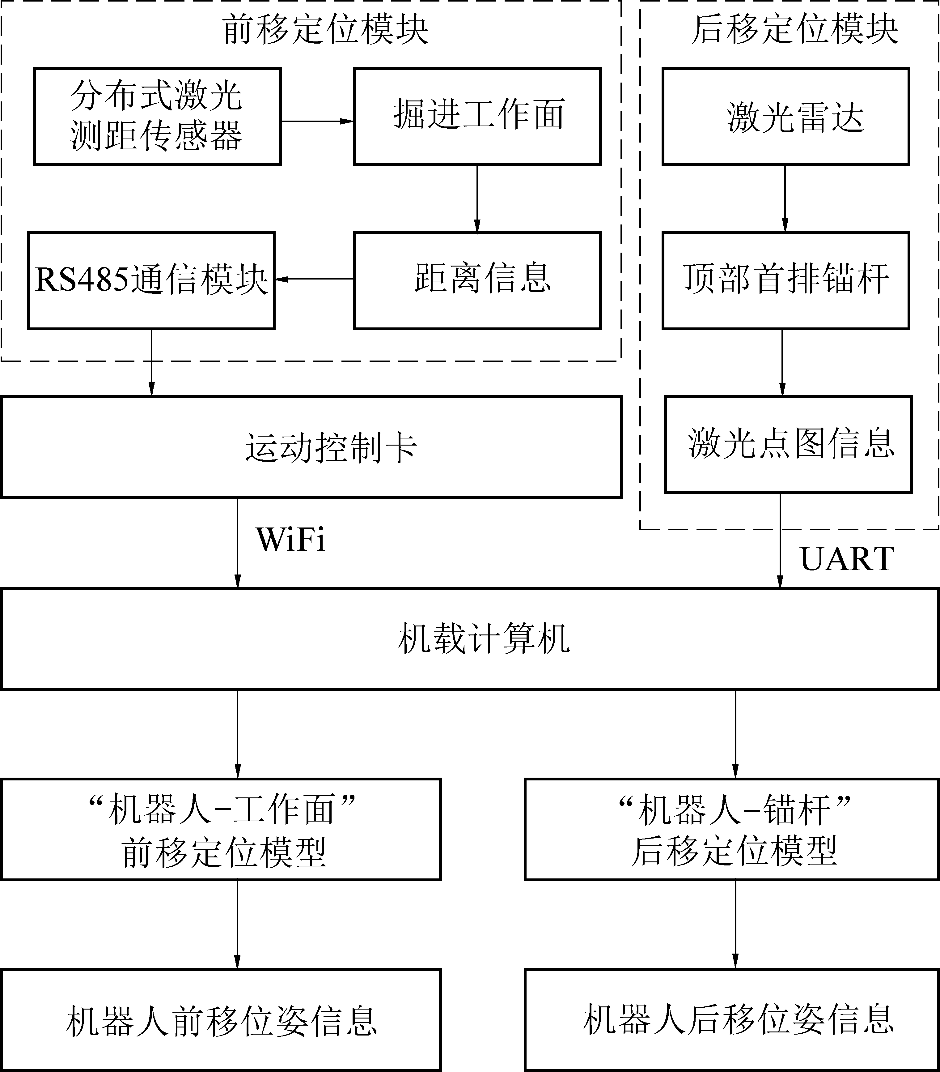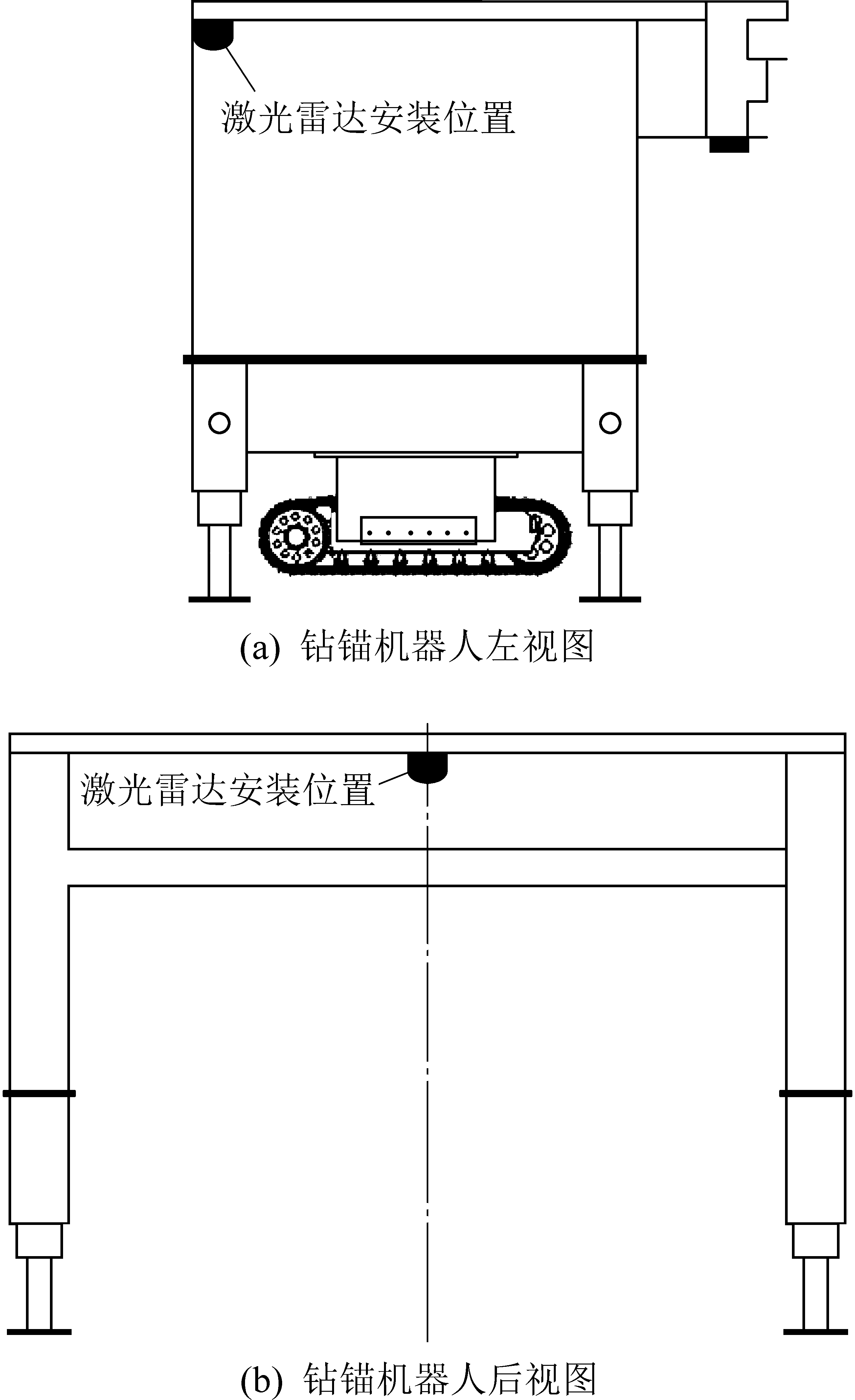 基于多传感器组合的钻锚机器人机身定位方法研究0 引 言巷道支护是煤炭安全开采关键环节,随着对煤炭需求量的增加,开采和支护效率也必须相对应的提高[1]。钻锚机器人是专门用于煤矿井下和其他井巷工程中巷道安装锚杆的支护类设备,可以代替工人完成物料运输、钻孔、锚杆装配等作业,有效地解决工人劳动强度大等问题。但目前大多数钻锚作业都是通过人工驾驶钻锚机器人移动以及工作机构位姿调整完成钻锚机器人定位,由此可见其定位精度和效率无法保证[2-3]。因此,研究性能好、可靠性高、适应性强的钻锚机器人机身精确定位技术,提升自动定位水平,构建自主定位系统对提高煤矿钻锚机器人自动化具有重要意义和应用价值[4-7]。 钻锚机器人机身定位问题实际上是通过机器人所携带的传感器及时反馈机器人所处的环境信息以及机器人本身的位姿信息,以确定自身在煤矿巷道的坐标和方位角[8-11]。国外对于多传感器组合定位技术的研究起步相对较早,在煤矿机器人井下移动自身定位研究方面做了大量工作[12-13]。美国桑迪亚实验室新一代搜救机器人通过所携带的光电编码器将记录机器人行走的位移信息,从而判断出机器人在井下的位置[14-15];HILARE机器人通过视觉传感器和雷达扫描按照加权平均进行信息融合并绘制环境地图,然后提取当前图像特征信息从而得出机器人位置[16]。中国科学院沈阳自动化研究所研制的CLIMBER移动机器人以及清华大学研制的智能移动机器人THMR-V采用红外、超声等测距传感器与惯性传感器进行信息融合,保证了移动机器人道路环境中的可靠定位要求[17-20]。 上述方法虽然能够获得机器人位置信息,但利用编码器定位时存在无法识别机器人打滑等问题;视觉传感器在光线暗时无法实现测量;利用惯性元件定位随时间增长会存在飘移现象;红外、超声等测距传感器随着测量距离增加,精度会有所降低,从而无法实现定位目标。因此,针对钻锚机器人机身定位困难等问题,笔者研究了基于激光测距传感器和激光雷达组合的钻锚机器人机身定位方法,建立适用于井下复杂环境的钻锚机器人机身定位系统,提高测量范围以及定位精度,消除光线暗时对测量的影响,对实现煤矿巷道钻锚机器人精确定位具有重大应用价值与研究意义。 1 钻锚机器人定位系统笔者所研究的钻锚机器人本体结构由履带行走机构和龙门框架组成,传统掘进机可在龙门框架内部通过。进行钻锚作业时,钻锚机器人与掘进机会存在空间干涉情况,因此将机器人定位内容分为前移定位和后移定位:①前移定位时,钻锚机器人需在距掘进工作面指定位置停止并完成位于掘进机机身高度以上的所有钻锚作业;②后移定位时,钻锚机器人完全后退至掘进机机身长度以外停止并进行补打剩余锚杆,确保钻锚机器人能够精确停止在钻锚平面是巷道支护作业顺利高效完成的前提。 针对上述钻锚作业特点,分别建立基于激光测距传感器的前移定位模型和基于激光雷达的后移定位模型。前移定位是以掘进工作面为参考,利用激光测距传感器检测钻锚机器人与掘进工作面之间的距离(即机器人-工作面),建立数学模型,实现前移定位的过程;后移定位是以后端首排顶部锚杆为参考,利用激光雷达扫描获得的点图信息(即机器人-锚杆),建立数学模型,实现后移定位的过程。钻锚机器人定位系统结构如图1所示。