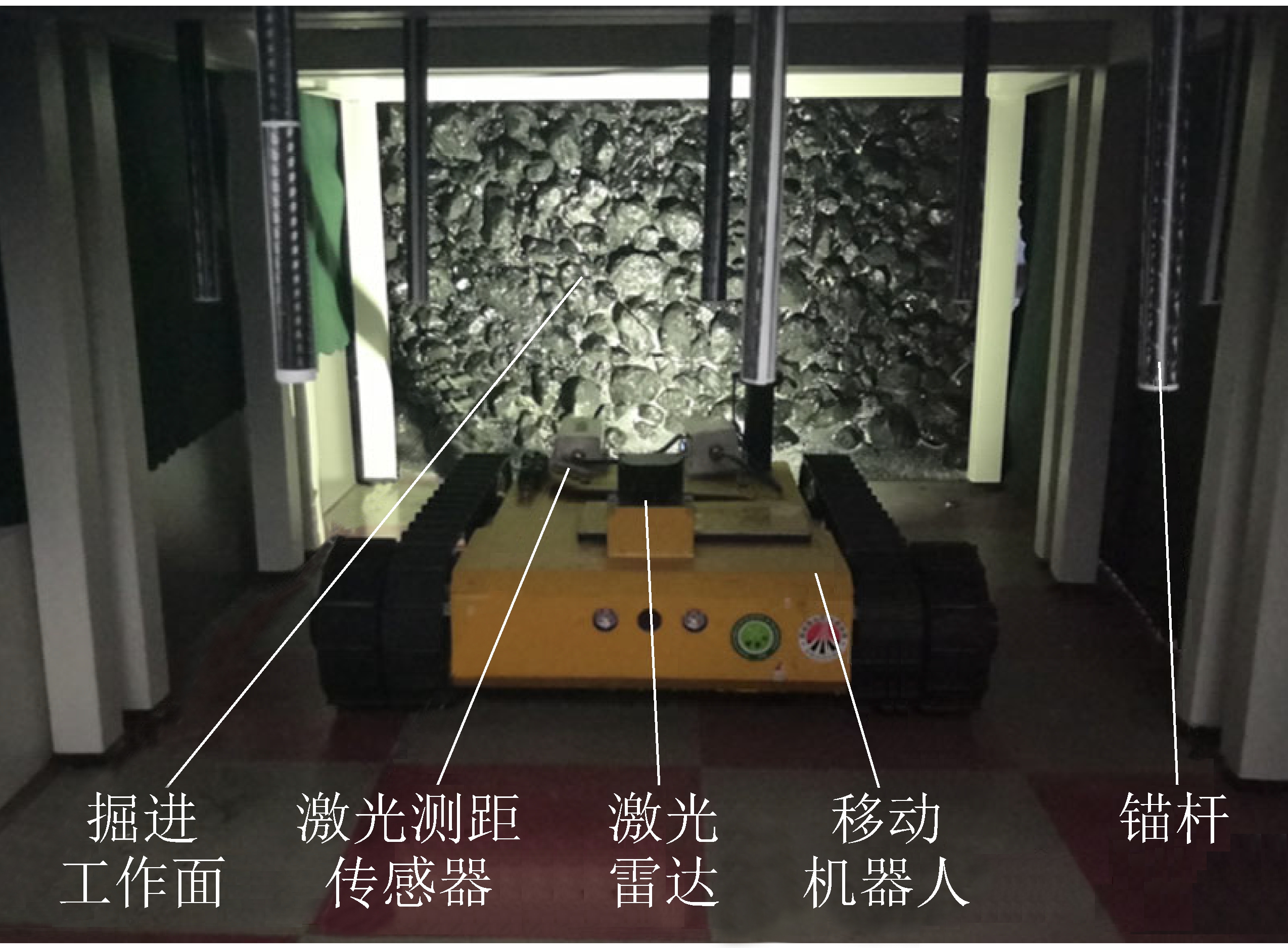 (5) 在ΔJOM中,根据余弦定理可得 cos θ=(a2+b2-M2)/2ab (6) 因此 (7) 将式(7)带入式(5)可得 (8) 由于钻锚机器人始终在所建立坐标正半轴,y>0,因此可得J点坐标值为 (9) 根据几何关系可得偏航夹角大小为 (10) 根据φ大小,可自主或手动调节钻锚机器人位姿,同时观察钻锚机器人与两侧煤壁的距离,当φ近似等于0,且a=b时,表明机器人位姿正确,即实现了钻锚机器人后移时的精确定位目标。 3 定位模型试验验证利用实验室移动机器人平台验证钻锚机器人定位模型的可行性(图9),定位系统由2个GJJ-5型激光测距传感器、URG-04LS-UG01激光雷达、锚杆、掘进工作面以及履带式移动机器人组成。