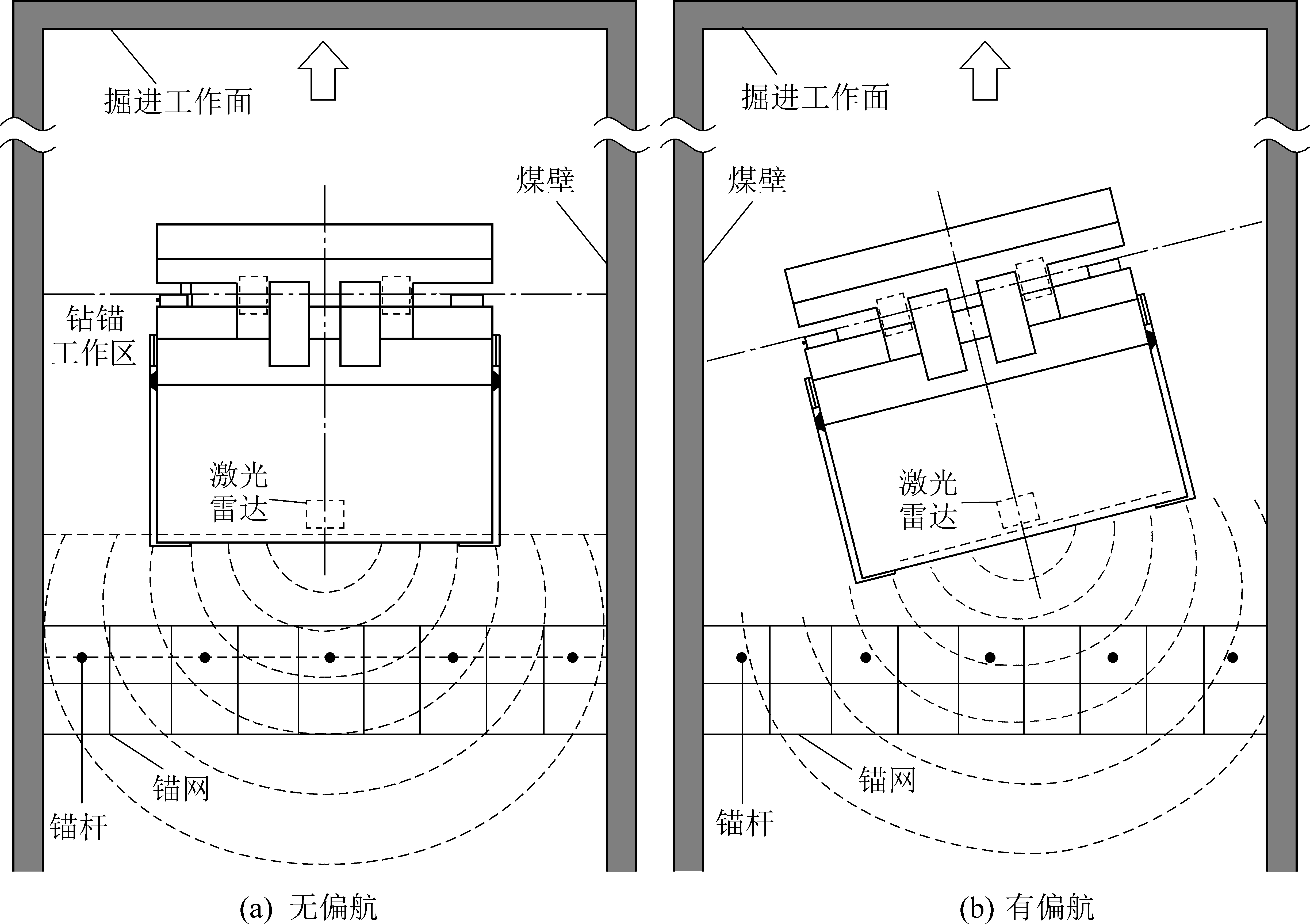 图6 激光雷达测距原理 钻锚机器人在向后移动时的位姿如图7所示。其中,图7a为钻锚机器人向后移动时未发生偏航的位姿示意,图7b为存在偏航的位姿示意,钻机所在平面与钻锚工作面不重合,因此需要建立激光扫描定位模型确定偏航夹角,然后确定出钻锚机器人所在位置,以便于位姿调整。
