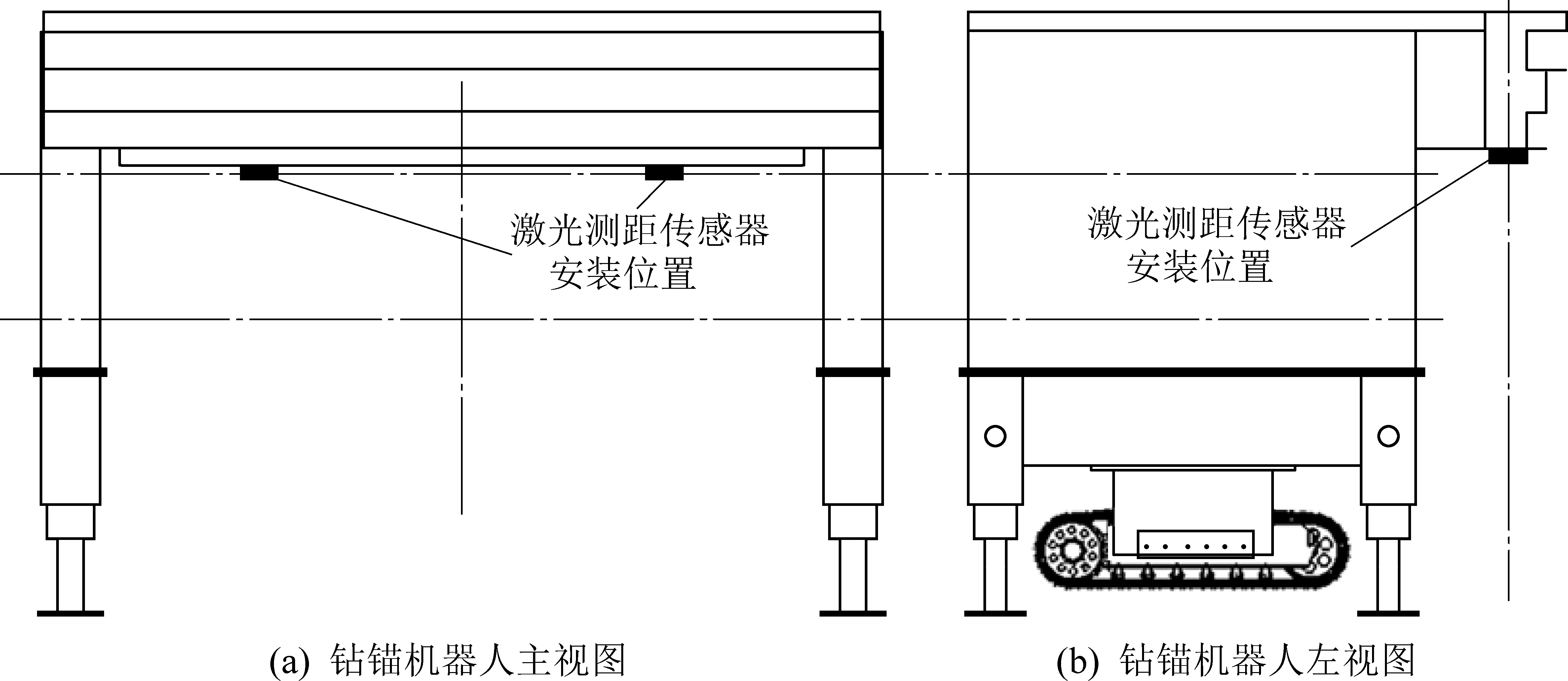 UART—通用异收发传输器 由图1可知,钻锚机器人定位系统主要由机载计算机、运动控制卡、前移定位模块和后移定位模块组成。 1)机载计算机。用于显示钻锚机器人在巷道中具体位姿信息,处理各传感器所采集的数据和算法分析,可远程干预钻锚机器人启停,将控制指令下发至运动控制卡并执行。 2)运动控制卡。用于接收各传感器所采集数据并进行A/D转换发送至机载计算机,同时向履带机构下发控制指令以驱动左右履带实现不同动作。 3)前移定位模块。由分布式激光测距传感器组成,其位于钻锚机器人顶梁结构处且呈左右对称分布。钻锚机器人向前移动时,利用分布式激光测距传感器测量钻锚机器人与掘进工作面的垂直距离,并根据左右传感器所采集的距离差建立“机器人-工作面”前移定位模型,求解机器人前移位姿信息。 4)后移定位模块。由激光雷达完成偏航夹角检测,其位于钻锚机器人后端顶部中线处。在钻锚机器人向后移动时,利用激光雷达所扫描到的点图信息,建立“机器人-锚杆”后移定位模型,求解机器人后移位姿信息。 最终将“机器人-工作面”模型解算的定位信息和“机器人-锚杆”解算的定位信息显示至机载计算机,实现人机交互等目标。 2 定位模型建立及分析为了精确获取钻锚机器人在煤矿巷道中的位置信息,必须对传感器模块所采集的数据进行分析处理。根据各传感器的布置以及工作方式,从以下2个方面对机器人定位系统进行建模分析:“机器人-工作面”前移定位模型和“机器人-锚杆”后移定位模型,并通过所得出的机器人位姿解算公式求解其在巷道中的位置。 2.1 “机器人-工作面”前移定位模型分析钻锚机器人在向前移动时,采用分布式激光测距传感器检测钻锚机器人前端与掘进工作面的距离信息,建立基于激光测距传感器的定位模型并进行分析,实现钻锚机器人前端绝对定位。激光测距传感器安装在钻锚机器人前端顶梁结构位置,传感器以机器人中心轴线为基准呈左右对称分布,以实现前后距离定位和偏航夹角计算,如图2所示。