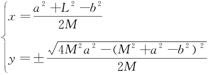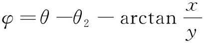 图8 钻锚机器人后移定位模型 以激光雷达所检测到左端锚杆为坐标原点,建立模型分析钻锚机器人向后移动时存在偏航夹角的运动数学模型。因此,以激光雷达所在坐标点为圆心可得几何圆方程为 (4) 由式(4)可得J点坐标为