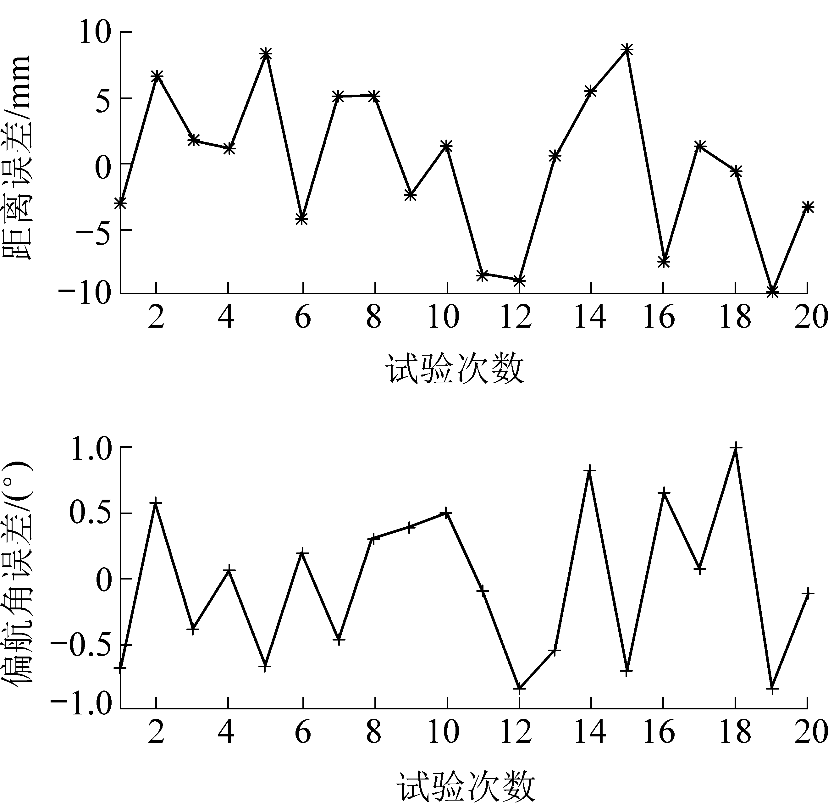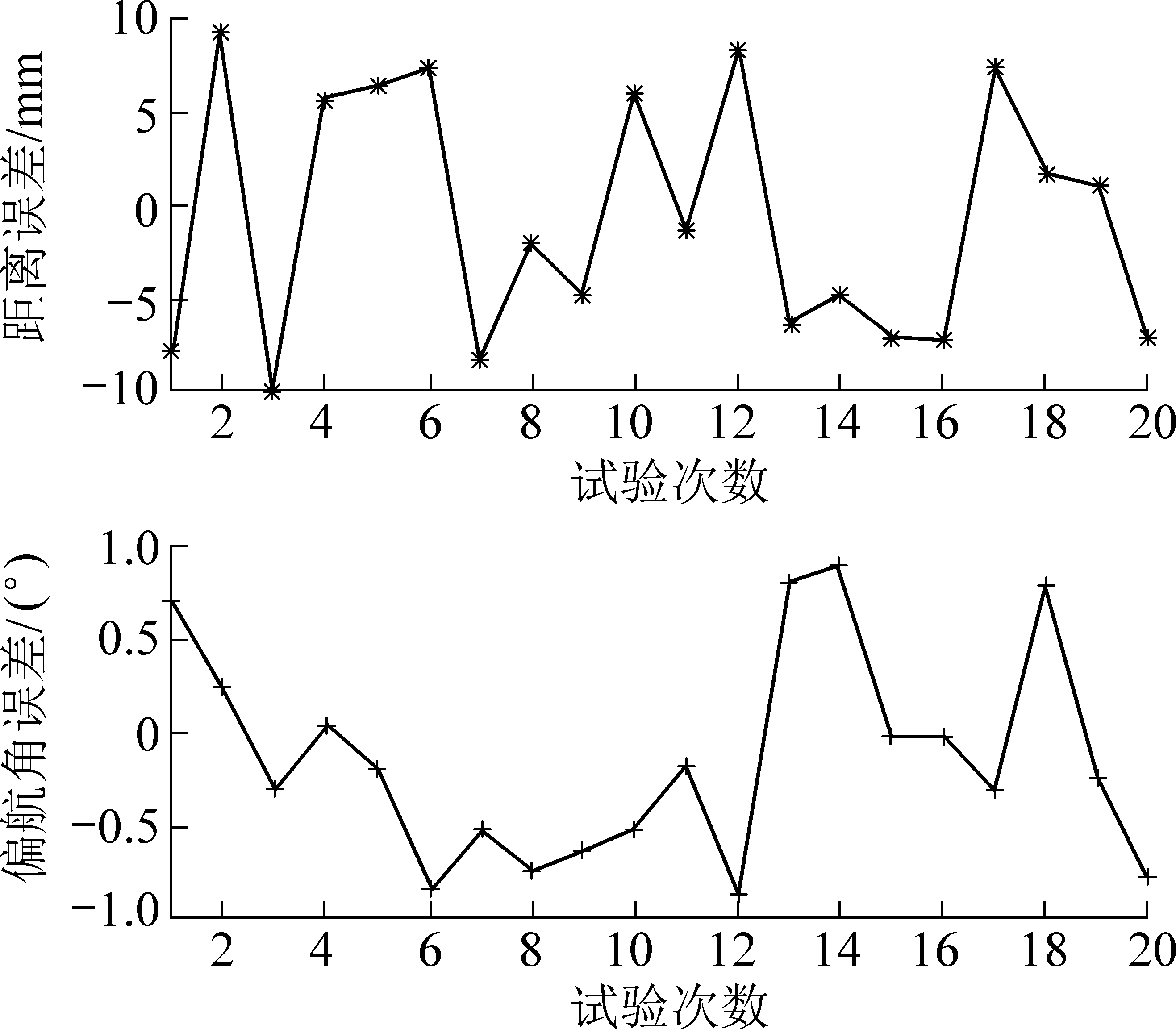图10 定位试验场地示意 3.1 机器人前移定位试验在进行机器人前移定位试验时,将真实测量得出的值与模型计算值进行对比,分别求解前移时的距离误差和偏航夹角误差,以机器人正前方为0°方向,左偏为正,右偏为负,试验结果见表1、如图11所示。 表1 钻锚机器人前移定位试验结果