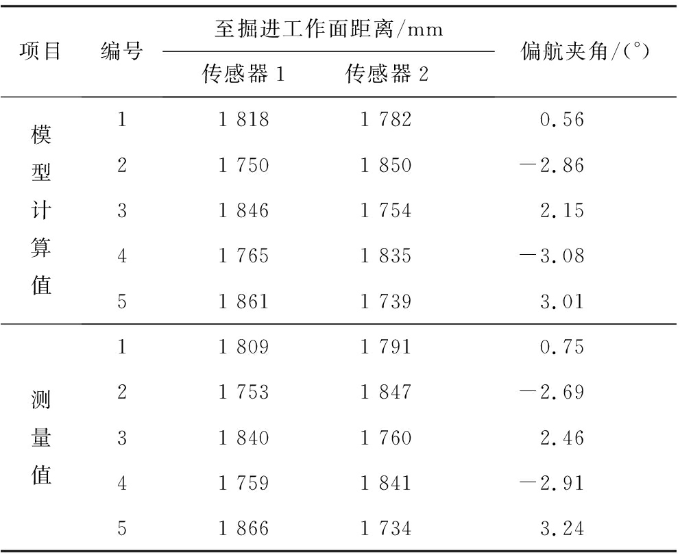 项目编号至掘进工作面距离/mm传感器1传感器2 偏航夹角/(°)模型计算值11 8181 7820.5621 7501 850-2.8631 8461 7542.1541 7651 835-3.0851 8611 7393.01测量值11 8091 7910.7521 7531 847-2.6931 8401 7602.4641 7591 841-2.9151 8661 7343.24