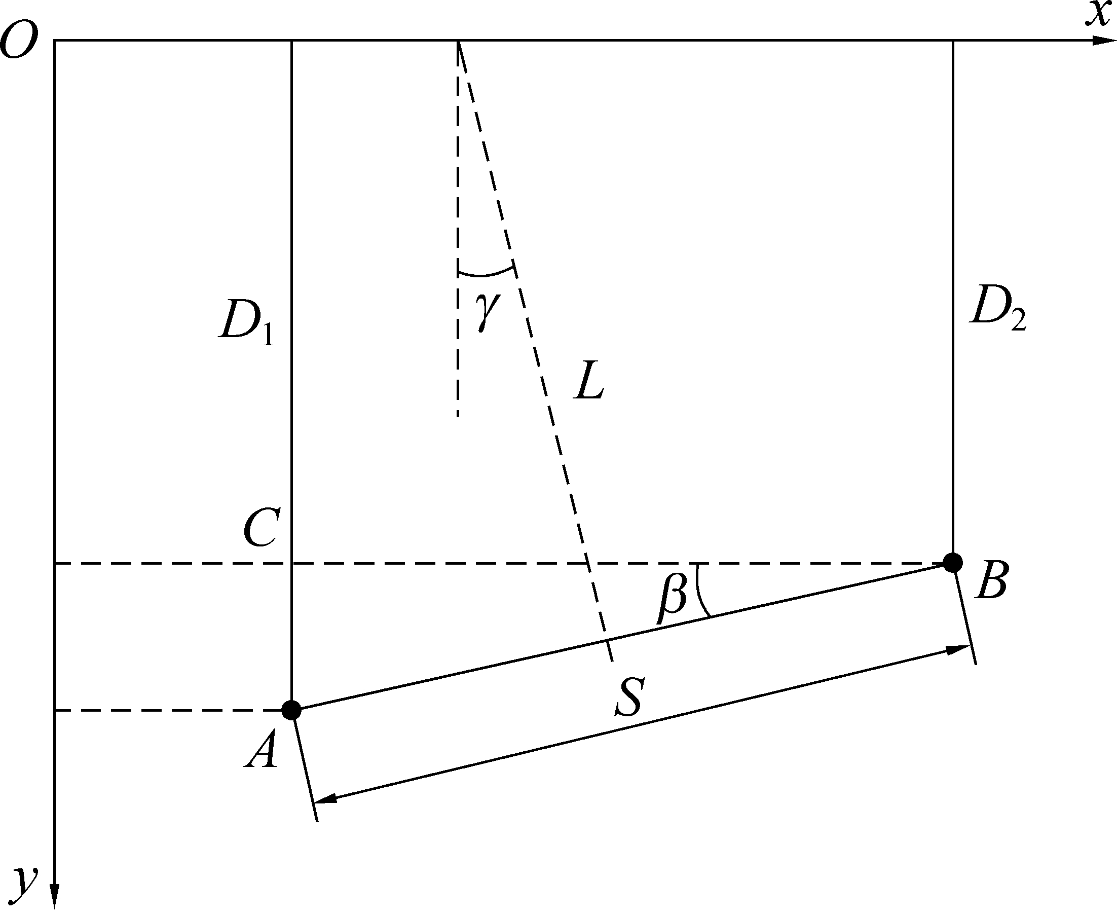 图3 前移时钻锚机器人位姿示意 假设钻锚机器人存在左偏航情况下的坐标关系如图4所示。以煤矿巷道左前端为坐标原点,沿巷道截面向右和煤壁向后分别为x轴和y轴正方向,建立二维平面坐标系。其中A、B表示左右顶梁两侧的激光测距传感器,其可通过云台设计使激光不受偏航夹角影响,始终正对掘进工作面;D1和D2分别为2个传感器所采集到的其与掘进工作面的距离大小;S为2个传感器之间的距离;直线L为S的垂直平分线;γ和β分别为机器人与y轴的偏航夹角和与x轴的偏航夹角,二者大小相等,因此,求解β大小即可得知钻锚机器人偏航夹角大小。 在△ABC中 sin β=AC/AB (1) 由图4可知,AC=D1-D2,AB=S,代入式(1)可得 sin β=(D1-D2)/S (2) β=arcsin(D1-D2)/S (3)