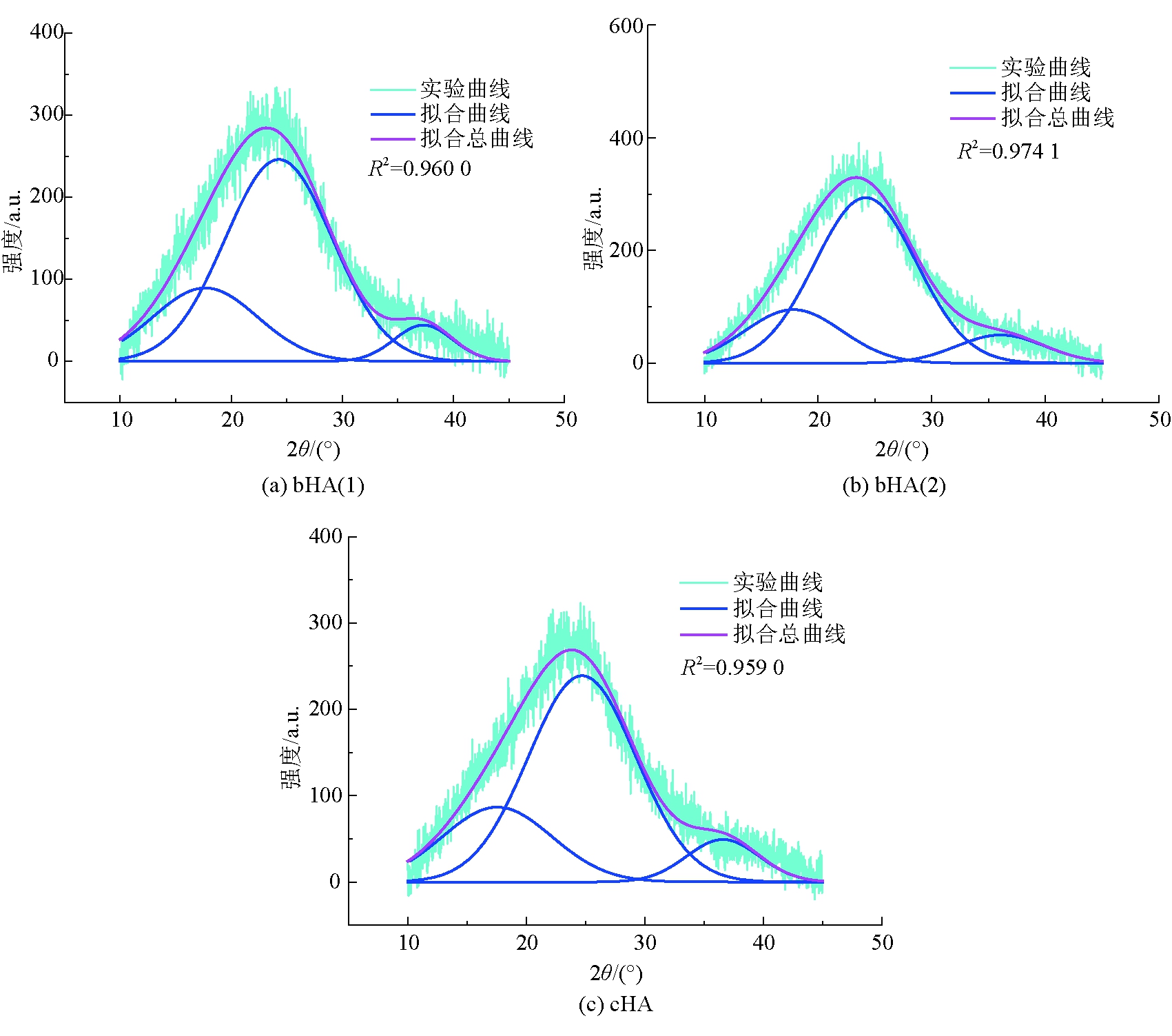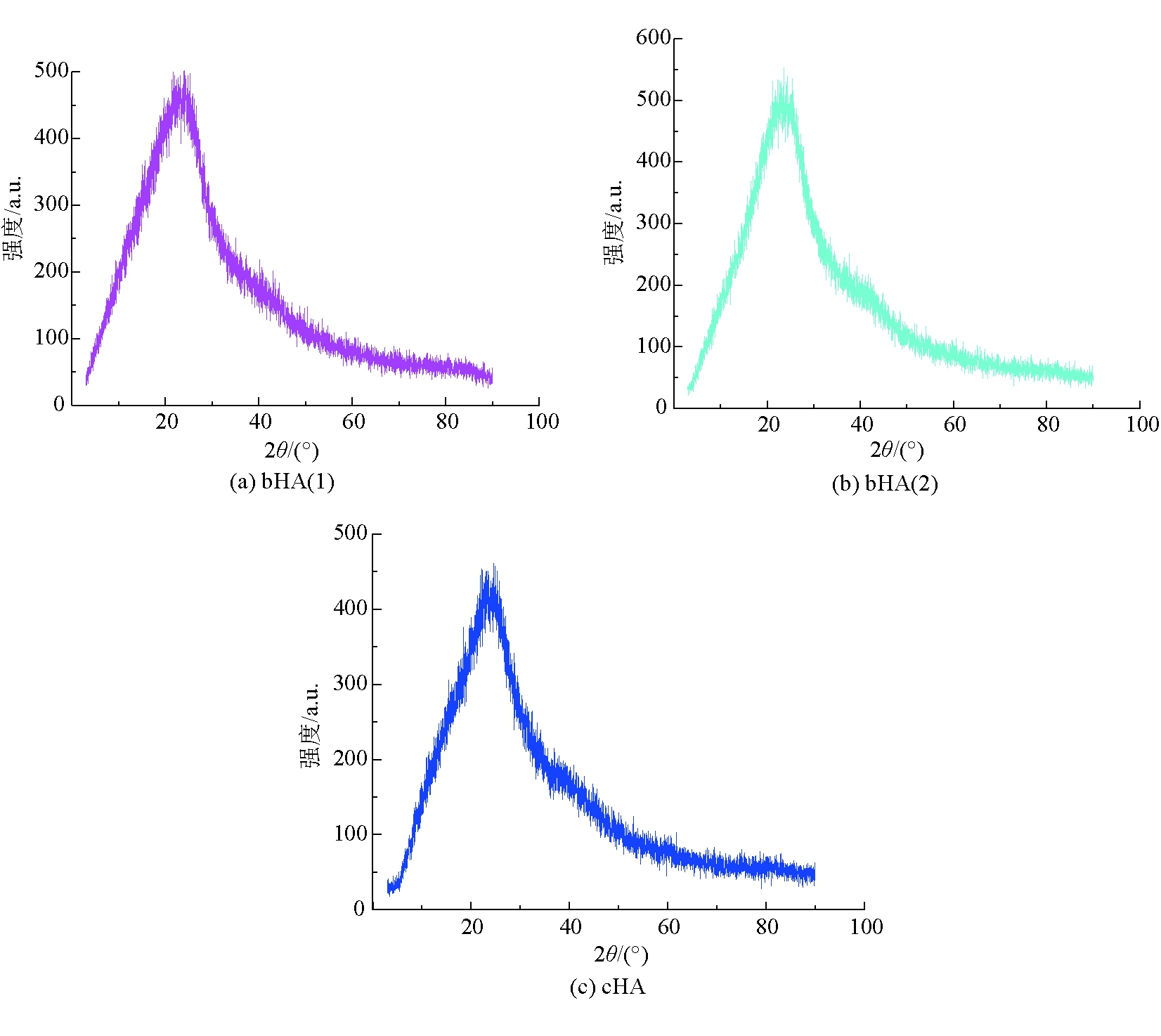 参数腐殖酸样品bHA(1)bHA(2)cHAfa0.9530.9510.971C'0.1500.1400.443 由表7可以看出,2种生物腐殖酸的芳香度相差不大,与化学腐殖酸相比芳香度较低,说明这2种生物腐殖酸含有脂肪族链较多,低分子化合物较多;从C'可以看出,这2种生物腐殖酸含氧官能团含量相差不大,都小于化学腐殖酸含氧官能团数量,这与元素分析的结果一致,这也解释了紫外分析中化学腐殖酸E4/E6比值大于生物腐殖酸,是由于化学腐殖酸含氧官能团含量较高引起的。 2.3.4 XRD分析 为了解生物腐殖酸和化学腐殖酸在微晶结构方面的差异,通过X-射线衍射对3种腐殖酸样品的XRD分析如图6所示。