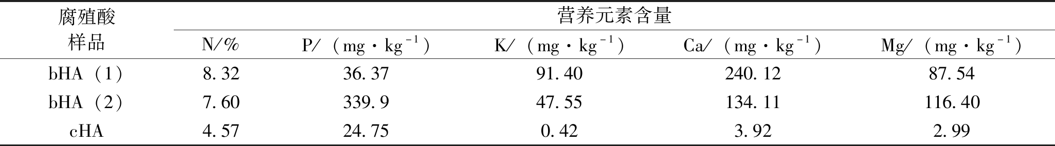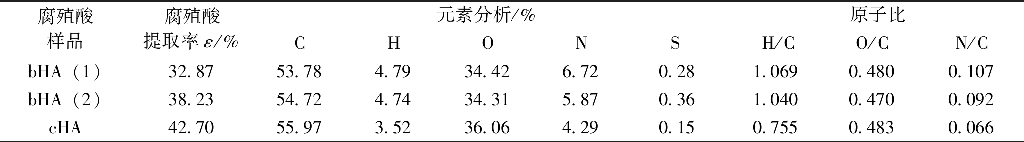 序号ABC提取率ε/%111136.32212231.30313332.78421232.00522325.25623137.62731328.89832133.47933236.06K1j1.0040.9721.074K2j0.9490.9000.994K3j0.9841.0650.869R0.0550.1650.205 2.3 腐殖酸的表征结果2.3.1 元素分析 按照1.4中方法提取的腐殖酸元素,bHA(1)和bHA(2)分别为荧光假单胞菌和蜡样芽孢杆菌降解产生的腐殖酸,cHA为碱抽提法提取的腐殖酸。腐殖酸样品的元素分析结果见表5。 表5 腐殖酸样品的元素分析结果