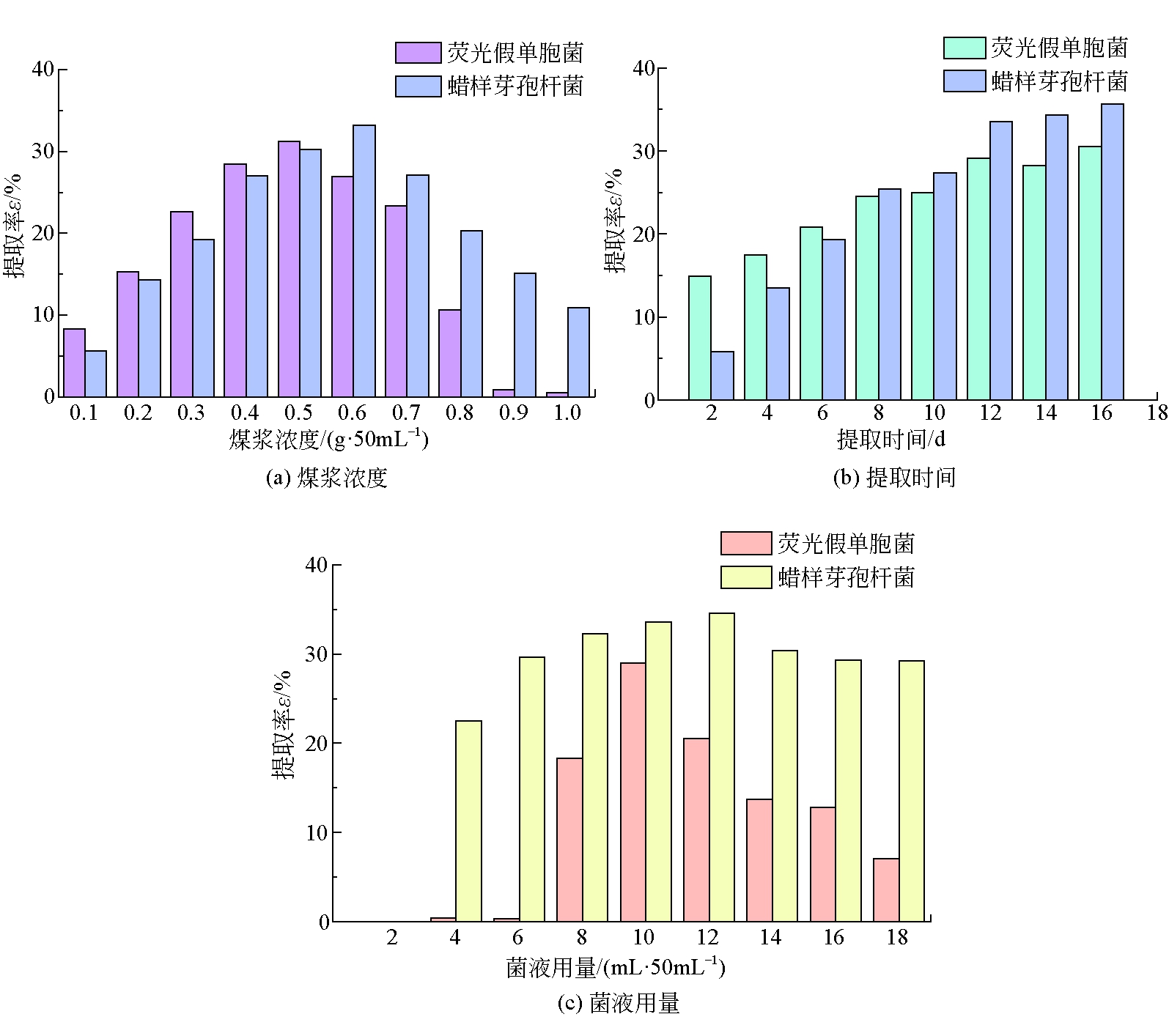 菌种因素水平123荧光假单胞菌A-煤浆浓度0.40.50.6B-降解时间10.012.014.0C-菌液用量8.010.012.0蜡样芽孢杆菌A-煤浆浓度0.50.60.7B-降解时间10.012.014.0C-菌液用量8.010.012.0 1.3.3 腐殖酸提取率的计算 腐殖酸提取率的计算见式(1)[3]: (1) 式中:ε——腐殖酸提取率,%; m1——起始煤样的质量,g; Mad——氧化煤中的含水量,%; m2——残煤的质量,g。 将离心后所得固相产物用蒸馏水洗涤至无菌体残留,干燥称重,通过式(1)计算腐殖酸提取率。 1.3.4 生物腐殖酸和化学腐殖酸的提取方法 生物腐殖酸提取:将离心后的液相产物用0.22 μm微膜过滤器进行过滤后获得滤液,用6 mol/L的HCl酸化至pH<2的沉淀腐殖酸,并通过离心(4 000 r/min,20 min)仪器进一步分离腐殖酸,然后再利用Spectrapore膜(MWCO 3500)纯化和透析腐殖酸,直到游离氯离子被洗掉,最后冷冻干燥,获得2种生物腐殖酸(bHA)。 化学腐殖酸提取:用0.1 mol/L的NaOH和0.1 mol/L的焦磷酸盐溶液从氧化煤中抽提,比例为1∶10(煤样∶萃取剂),然后再通过上述步骤提取获得化学腐殖酸(cHA)[17]。 1.4 腐殖酸表征方法采用Perkin Elmer 2400分析仪和5E-S3200库仑硫分析仪对提取腐殖酸样品进行S元素分析;使用TU1950 型紫外可见分光光度计(UV-Vis)测定腐殖酸样品E4/E6(465 nm/665 nm)比率;通过Nicolet iN 10 &iZ10型傅里叶红外光谱仪定量溴化钾压片法(固相产物∶KBr为1 mg∶200 mg),在4 000~400 cm-1范围内,分辨率4 cm-1对腐殖酸样品进行红外光谱扫描;利用Mini Flex 600 X-射线衍射仪对腐殖酸样品进行分析,扫描范围为5°~80°,扫描速度为2°/min;使用KDN-520型凯氏定氮仪和TITAN 10型微波消解仪通过凯士定氮法和火焰光度法对腐殖酸的N、P、K、Ca、Mg元素进行测定。 2 结果与分析2.1 单因素实验结果单因素对生物腐殖酸提取率的影响如图1所示。 由图1(a)中可以看出,随着煤浆浓度的增加,荧光假单胞菌和蜡样芽孢杆菌对煤样中腐殖酸的提取率均先增加后降低。在煤浆浓度分别为0.5 g/50 mL和0.6 g/50 mL时,达到的最优提取率分别为31.20%和33.22%。原因可能是当煤浆浓度过大时抑制了荧光假单胞菌和蜡样芽孢杆菌的生长。 由图1(b)中可以看出,随着降解天数的增加,荧光假单胞菌和蜡样芽孢杆菌对煤样中腐殖酸的提取率均呈现先增加后趋于稳定的现象,均在提取12 d时处于缓慢增长期,提取率分别为29.08%和33.55%。原因可能是在降解时间达到12 d时,培养基中的营养物质几乎被细菌消耗,部分细菌趋于死亡[18],使得12 d后的腐殖酸提取率变化不大。 由图1(c)中可以看出,随着菌液用量的增加,荧光假单胞菌和蜡样芽孢杆菌对煤样中腐殖酸的提取率均呈现出先增加后降低的趋势,分别在菌液用量为10 mL/50 mL和12 mL/50 mL时,对煤样中腐殖酸的提取率达到最大,分别为29.02%和34.51%。这是由于菌液接种量较低时,煤浆环境对细菌生长有抑制作用,随着菌液接种量的增加抑制作用减弱,当接种量超过一定数值后,有限的营养物质导致细菌之间的竞争和抑制,从而影响了对煤样腐殖酸的提取效果。