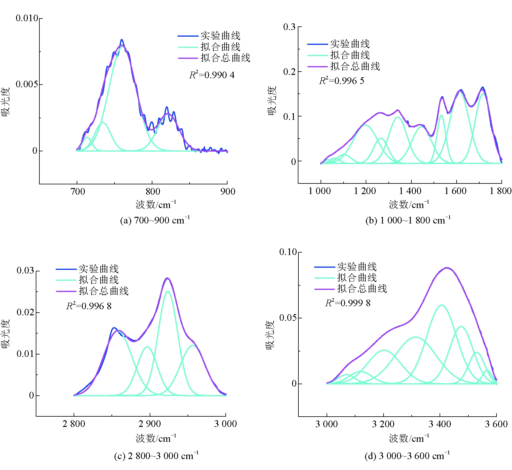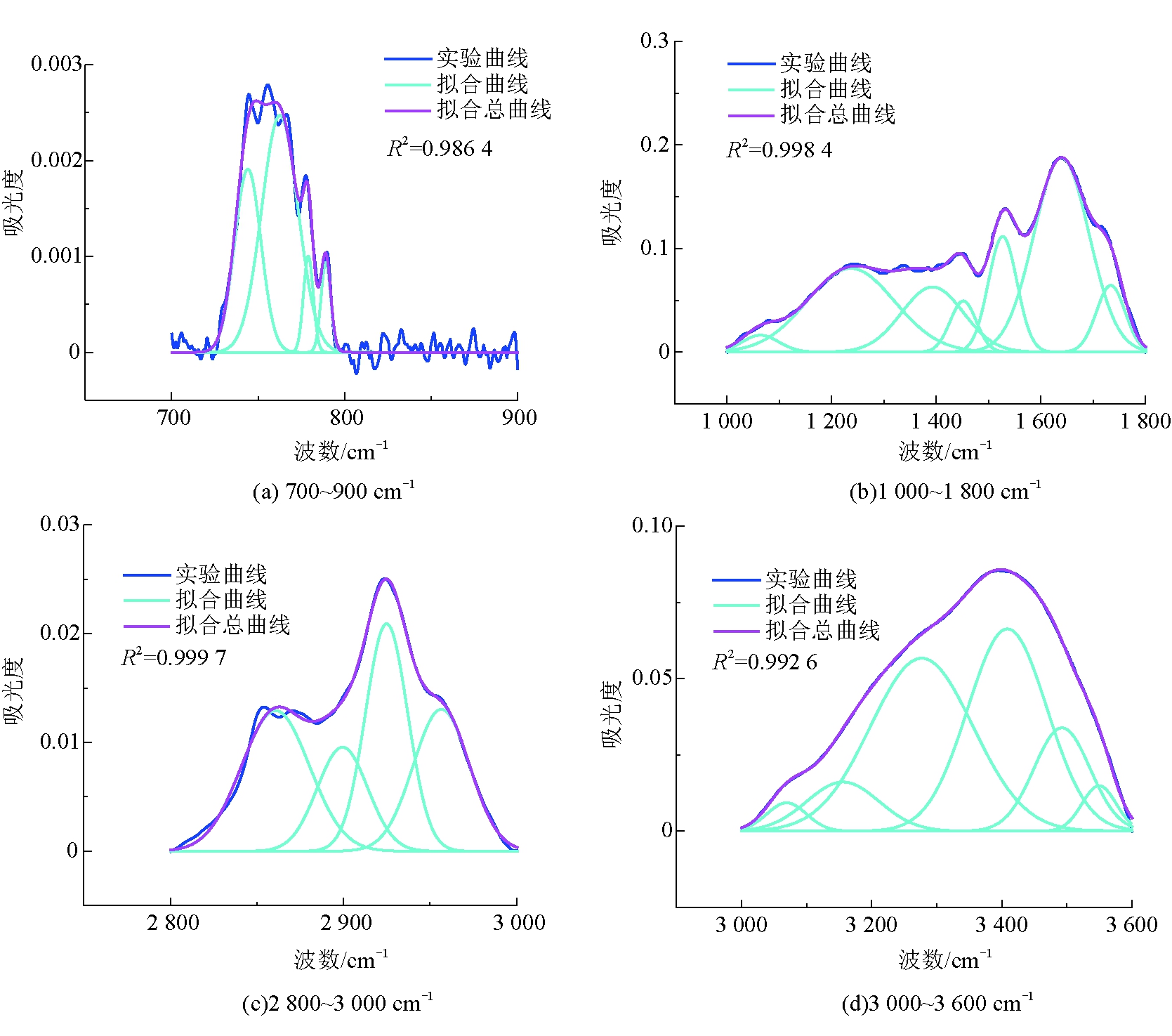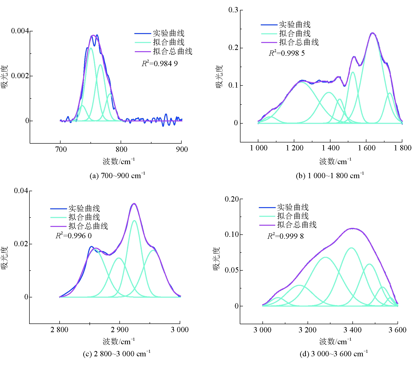 图2 3种腐殖酸的FTIR分析 由图2中可以看出,3种腐殖酸样品的红外光谱特征峰及主要特征峰的出现位置基本相同。3 425 cm-1处的吸收峰是N-H或羟基(OH)伸缩振动的标志,吸收峰位于2 930 cm-1和2 804 cm-1归因于脂肪族CH3和CH2的C-H伸缩振动,吸收峰位于1 635 cm-1是羧酸的O=C伸缩振动,2 625 cm-1的吸收峰是由羧酸中OH伸缩振动引起的,在1 533 cm-1处的吸收峰为硝基伸缩振动引起的[18],吸收峰在1 385 cm-1是由酚羟基的OH变形和C-O拉伸振动引起的,同时,吸收峰位于762 cm-1表示芳香族C-H的拉伸振动[2]。FTIR光谱的吸收峰主要分为4个区域:3 600~3 000 cm-1波段羟基(-OH)的吸收区,3 000~2 800 cm-1波段脂肪族结构的吸收区,1 800~1 000 cm-1波段含氧结构的吸收区,900~700 cm-1波段的芳环结构的吸收区[20],对这4个吸收峰分别进行拟合,得到高斯峰,并确定其面积、半峰宽等参数,从而确定fa(芳香度)、C'(含氧结构参数) [21]。3种腐殖酸样品的红外分峰拟合如图3~图5所示。