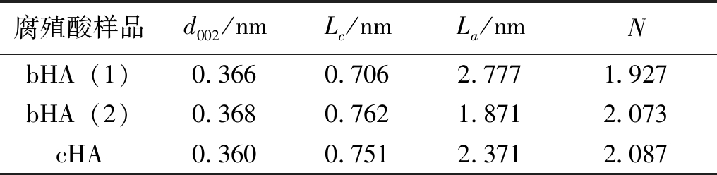 图7 3种腐殖酸XRD分峰 表8 3种腐殖酸XRD拟合结构参数
