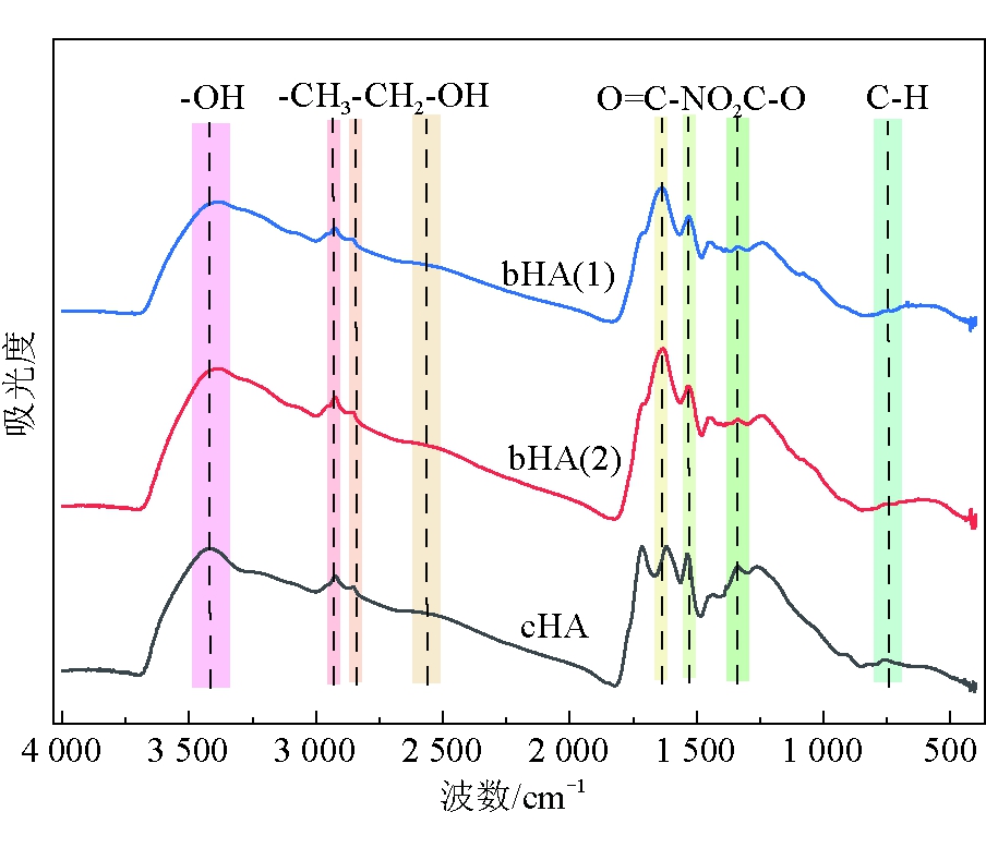 参数腐殖酸样品bHA(1)bHA(2)cHAE4/E64.424.055.62 由表6可以看出,E4/E6比率表明2种生物腐殖酸拥有比化学腐殖酸高的分子量和芳香度,这与元素分析结果相矛盾,这可能是由于化学腐殖酸中含氧量较高引起其E4/E6比值升高[14,19]。 2.3.3 红外光谱分析 为进一步了解腐殖酸的结构和官能团排列,并对比生物腐殖酸和化学腐殖酸的芳香度及含氧结构参数,对3种腐殖酸的FTIR分析如图2所示。