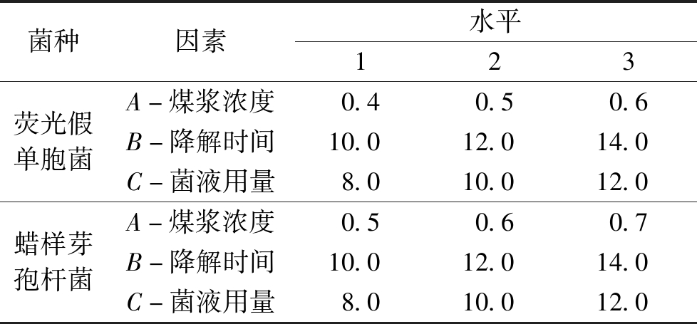 煤样工业分析MadAadVdafFCdaf元素分析CHONS原煤6.628.3454.7145.2968.173.4626.131.950.28氧化煤4.928.4548.9051.1058.852.6834.553.880.04 1.2 菌种的培养由于富油煤油气含量较高的属性,选取了降解原油效果较好的棒状杆菌属[16]的2种细菌,即荧光假单胞菌(Pseudomonas fluorescens)和蜡样芽胞杆菌(Bacillus cereus),均购买于中国微生物菌种保藏中心(CICC),编号分别为CICC 20066和CICC 21290。培养基均采用CICC所提供的牛肉膏培养基配方,即牛肉膏3 g、蛋白胨5 g、氯化钠5 g、去离子水1 L。将菌种接种于装有50 mL牛肉膏培养基的锥形瓶内,并置于恒温30 ℃且160 r/min的摇床内振动培养。 1.3 煤样腐殖酸的提取1.3.1 单因素实验设计 在含0.3 g灭菌煤样的150 mL锥形瓶中加入50 mL灭菌的牛肉膏培养基和10 mL菌液,置于恒温30 ℃、160 r/min的振动培养箱振动培养。在相同培养条件下分别改变煤浆浓度(0.1、0.2、0.3、0.4、0.5、0.6、0.7、0.8、0.9、1.0 g/50 mL)、提取时间(2、4、6、8、10、12、14、16 d)、菌液用量(2、4、6、8、10、12、14、16、18 mL/50 mL)研究各因素对煤样腐殖酸提取率的影响,实验结束离心操作(10 000 r/min,20 min)后分离固相产物和液相产物备用。 1.3.2 正交实验设计 在单因素实验的基础上,设计三因素三水平正交实验得出荧光假单胞菌和蜡样芽孢杆菌降解郭家沟富油煤提取腐殖酸的最佳工艺条件,正交实验因素及水平见表2。 表2 2种细菌降解氧化煤提取腐殖酸的正交实验设计