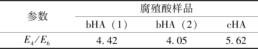 腐殖酸样品腐殖酸提取率ε/%元素分析/%CHONS原子比H/CO/CN/CbHA(1)32.8753.784.7934.426.720.281.0690.4800.107bHA(2)38.2354.724.7434.315.870.361.0400.4700.092cHA42.7055.973.5236.064.290.150.7550.4830.066 由表5可以看出,2种细菌降解生成的腐殖酸元素组成差别不大,与化学方法提取的腐殖酸相比,H、N及S含量较高,O、C含量较低;H/C原子比代表芳香度,H/C越低则意味着芳香度和分子量越高,2种细菌降解产生的腐殖酸H/C原子比几乎相同并大幅高于化学方法提取的腐殖酸,这说明细菌降解生成的腐殖酸含有更多的脂肪族化合物,芳香度和分子量较低;O/C原子比反映腐殖酸中的氧含量,2种细菌降解产生的腐殖酸与化学腐殖酸相比O/C原子比较低,表明2种生物腐殖酸比化学腐殖酸的含氧官能团少[2,14];N/C原子比反映了腐殖酸中的氮含量,通常煤衍生腐殖酸的N/C值通常在0.05左右,2种生物腐殖酸的N/C比较高可能是其均具有脱氨基能力[17]。 2.3.2 紫外分析 不同波长下的UV-Vis比值被用作腐殖酸的重要表征指标,E4/E6(465 nm/665 nm)是最常用的吸光度比,E4/E6比率主要与腐殖酸的分子量及芳香度相关,通常E4/E6值随分子量和芳香度的增加而降低,同时,该比值还会随着氧含量的增加而增加。3种腐殖酸样品的紫外E4/E6比率见表6。 表6 腐殖酸样品E4/E6比率