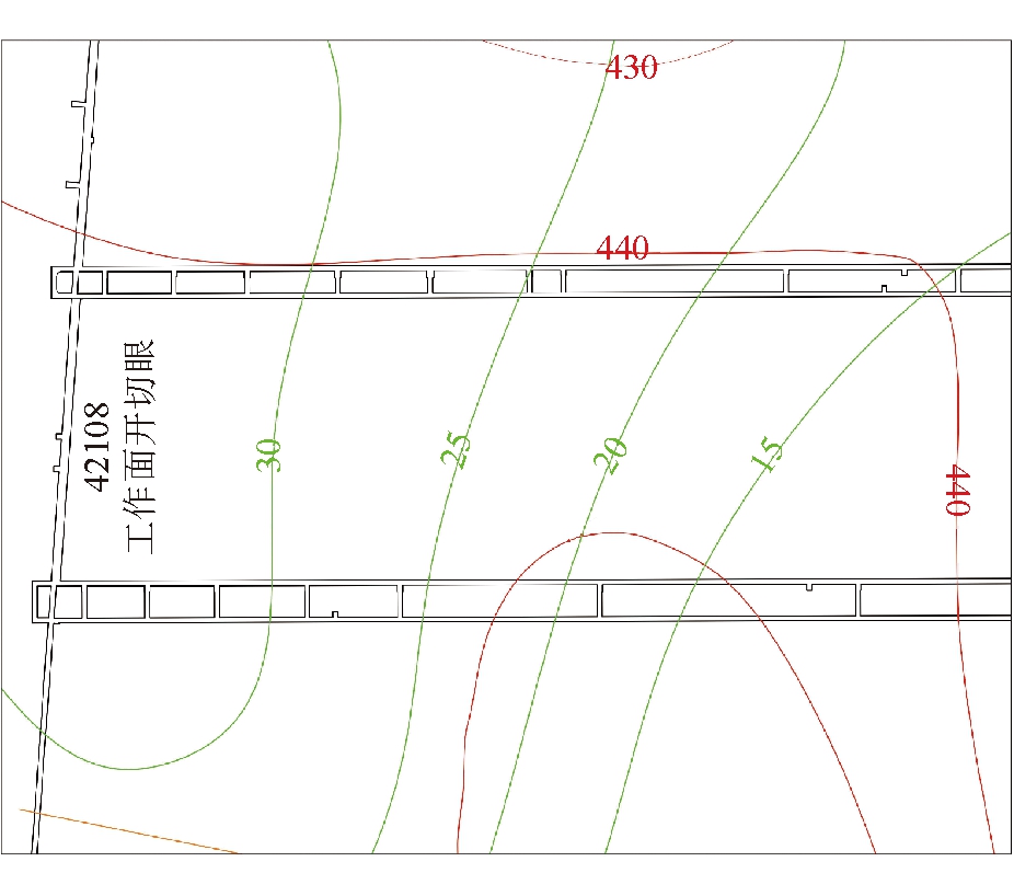 图1 固定翼垂直起降无人机 2 无人机岩移监测实例布尔台煤矿位于内蒙古自治区鄂尔多斯市伊金霍洛旗,神东矿区北部。利用无人机技术对布尔台煤矿某区域的工作面岩移情况进行监测分析,观测区域内的平均岩层厚度约为440 m,松散层厚度约为30 m,平均煤层厚度约为6.1 m,实际平均采高为6.1 m,开切眼处煤层的倾角为1°,倾向线处煤层的倾角则为1°48′,岩移监测区域煤层总体为近水平煤层。工作面岩层与松散层厚度等值线如图2所示。