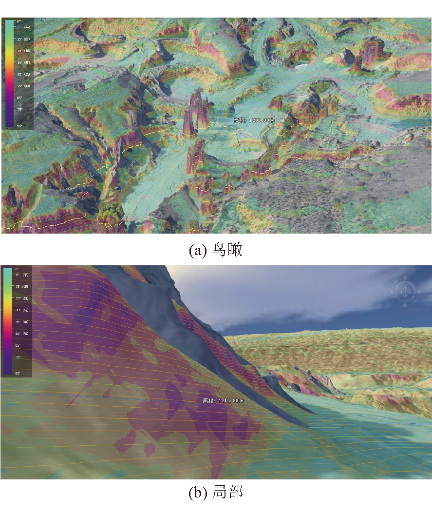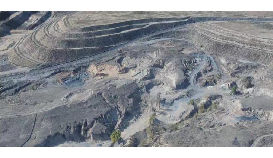 图6 无人机岩移监测影像 完成岩移数据的采集工作之后,需要利用计算机软件进一步对采集到的数据进行处理,通过建模仿真建立三维空间模型,从而获得完整清晰的地面岩移数据。另外,需要注意的是,由于无人机采集到的数据其精度可以达到厘米级分辨率,因此仿真的数据量较大。整个数据的处理过程以及三维空间模型的搭建需要较大的算力支持,对于计算机的性能有一定的要求。经过三维模型仿真计算后输出的岩移采集区域的鸟瞰以及局部如图7所示。