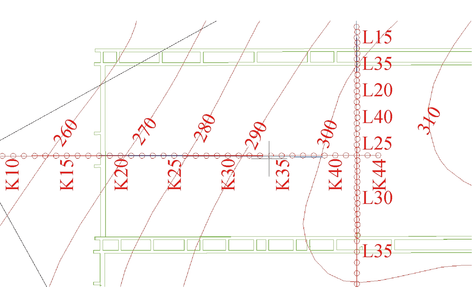 图2 工作面岩层与松散层厚度等值线 2.1 无人机监测线布设方案观测线按照设计书中的要求进行布设,走向线开切眼外边线长度为340 m,内边线长度为520 m,共44个观测点,点号以K开头;倾向线上山段及下山段各500 m,共51个观测点,点号以L开头,倾向线与走向线相交于距开切眼480 m的位置(H0为平均采深295 m,在图3中工作面覆盖层厚度等值线从260~350 m,取平均值295 m),观测桩间距为20 m。观测线外侧共布设有3组共6个控制点,每组间距50 m。观测线布置示意如图3所示。