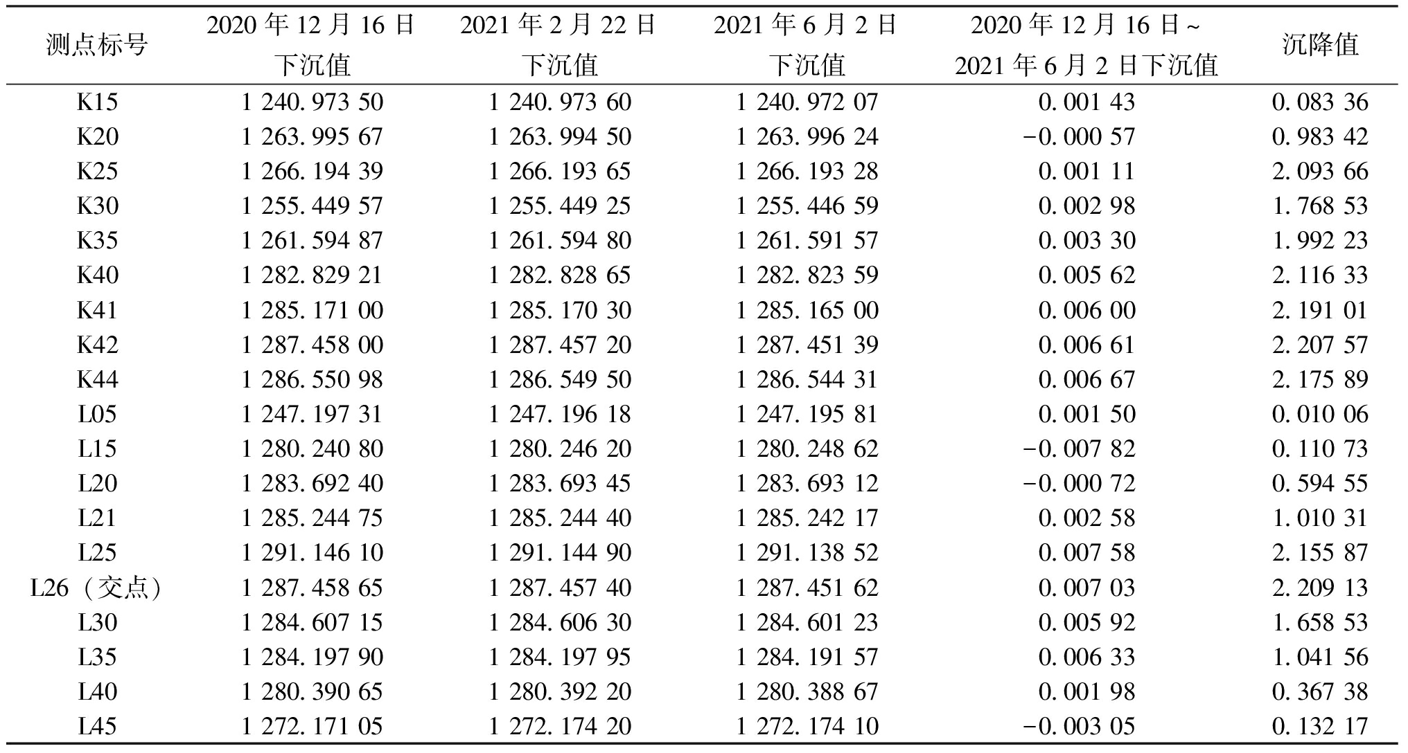 测点标号2020年12月16日下沉值2021年2月22日下沉值2021年6月2日下沉值2020年12月16日~2021年6月2日下沉值沉降值K151 240.973 501 240.973 601 240.972 070.001 430.083 36K201 263.995 671 263.994 501 263.996 24-0.000 570.983 42K251 266.194 391 266.193 651 266.193 280.001 112.093 66K301 255.449 571 255.449 251 255.446 590.002 981.768 53K351 261.594 871 261.594 801 261.591 570.003 301.992 23K401 282.829 211 282.828 651 282.823 590.005 622.116 33K411 285.171 001 285.170 301 285.165 000.006 002.191 01K421 287.458 001 287.457 201 287.451 390.006 612.207 57K441 286.550 981 286.549 501 286.544 310.006 672.175 89L051 247.197 311 247.196 181 247.195 810.001 500.010 06L151 280.240 801 280.246 201 280.248 62-0.007 820.110 73L201 283.692 401 283.693 451 283.693 12-0.000 720.594 55L211 285.244 751 285.244 401 285.242 170.002 581.010 31L251 291.146 101 291.144 901 291.138 520.007 582.155 87L26(交点)1 287.458 651 287.457 401 287.451 620.007 032.209 13L301 284.607 151 284.606 301 284.601 230.005 921.658 53L351 284.197 901 284.197 951 284.191 570.006 331.041 56L401 280.390 651 280.392 201 280.388 670.001 980.367 38L451 272.171 051 272.174 201 272.174 10-0.003 050.132 17 3.2 变形曲线分析根据图8和图9下沉曲线特点可知,目前施工工作面走向线下沉盆地存在明显的底部,可以判断在2020年12月16日,监测区域已接近充分采动,而后随着工作面的不断推进,观测线各观测点的下沉量都没有太大变化,曲线整体形态保持不变;倾向线下沉曲线呈底部平缓的非对称碗型,底部平缓是充分采动的主要特征,倾向线下沉曲线上山部分与下山方向相比坡度小,影响范围更大是由于上山方向为邻近的采空区,工作面采动后,受其影响的邻近工作面采空区基岩力学平衡被打破,并发生了活化,因此靠近工作面一侧的采空区地表继续下沉数公分至十数公分不等。 工作面地表下沉曲线为标准形态,整体趋势相对平缓,采空区边界距盆底边缘距离较大,坡度较小,这是采深塌陷盆地的典型特征之一。K42点为走向线最大下沉点,距开切眼480 m,总下沉量2.208 m(采高约3.6 m),盆底次低位下沉点为K41。倾向线距开切眼480 m,交点为K42/L26,下沉曲线总体呈碗型,有一个明显的底部,是充分采动的典型特征,由于工作面不是该盘区首采工作面,上山方向毗邻工作面于2019年回采,受采动叠加影响使得邻近采空区活化,因此倾向线下沉盆地呈不对称形态,上山方向坡度明显小于下山方向,因为是充分采动,所以最大下沉点L26仍处于工作面中心位置,其总下沉量2.208 m(采高约3.6 m)。倾斜变形曲线如图10所示,曲率曲线如图11所示,水平变形曲线如图12所示。