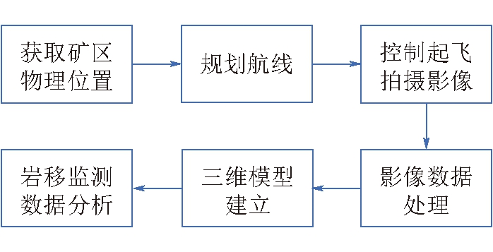 图3 观测线布置示意 2.2 无人机岩移监测方案应用无人机航测技术监测岩移可以大大减少野外的工作量和工作难度。无人机航测只需要配备1~2人即可完成飞行采集工作,航测任务结束后利用计算机对数据进行后续的数据处理工作。相对于传统岩移数据的采集,无人机岩移监测可大大提高数据采集工作效率[13]。无人机由于其低空飞行的特点,搭载相机系统可以获取厘米级分辨率的数据,满足后期高精度成像需求[14]。本次无人机监测煤矿岩移的主要工作流程如图4所示。