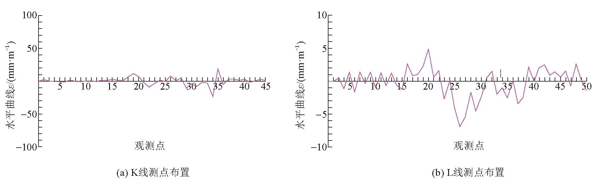 图12 水平变形曲线 (1)倾斜曲线表示地表移动盆地内倾斜的变化规律,是移动盆地内相邻两观测点的下沉高差与两点间长度之比。i越大表明对应的下沉曲线坡度越陡,由图10可以看出,在最大下沉观测点K42/L26前进方向i趋近于0,在拐点(下沉曲线凹凸变化处)处(K21、L21、L30)倾斜最大,L线为完整的下沉曲线,有2个方向相反的最大倾斜值。 (2)曲率曲线为两相邻线段的倾斜差与两线段中间点的水平距离的比值,表示地表移动盆地内曲率的变化规律,从曲线图可以看出下沉盆地的曲率变形值较大的位置出现在下沉盆地边缘,这些区域虽然下沉量较小但往往受到的曲率变形作用却是最大的。 (3)水平变形曲线表示地表移动盆地内水平变形分布规律,是移动盆地一线段两端点的水平移动差与此线段长度之比。正极值为最大拉伸值,通常应位于拐点附近,负极值为最大压缩值出现在盆底边缘,但该工作面水平变形曲线较为平缓,变化规律不典型,表明上覆岩层断裂后水平挤压作用在平面方向上较小。 3.3 地表移动持续时间的确定移动变形阶段及延续时间的确定是岩移观测数据分析中的重要工作之一,不同采矿工艺下的采空区在各移动变形阶段持续时间上有着明显的差别,是地表移动变形的重要特征之一,研究区工作面也存在比较明显的4个移动变形阶段。 (1)变形前期。2020年4月28日工作面开始回采,5月10日前为试采期每天进尺3~5 m,试采结束至2020年7月5日(工作面处于走向线边界处)前平均每天进尺9 m左右。测量队在回采后对工作面开切眼附近的观测点进行巡视测量(根据井下来压情况,安排观测时间,尽量精确捕捉地表移动变形的开始时间),2020年5月10日,工作面回采推进至68 m时,在走向线上的K21点为最大下沉点,下沉量12 mm,这标志着地表移动变形已经开始。 (2)移动变形活跃阶段。2020年5月10日-2020年9月1日为观测区域地表移动变形活跃阶段(地表下沉速度大于1.67 mm/d),5月10日工作面回采推进至68 m,最大下沉点K21点下沉量较5月6日下沉12.3 mm,日平均下沉量达3 mm,该点附近地表移动变形进入活跃期,按照《煤矿测量规程》要求,此期间平均每周对观测点进行1次四等水准测量,并在工作面推进位置处于0.7 倍的采深H0、1.4倍的采深H0(H0为平均采深295 m)处及活跃期结束时共进行3次的平面观测。 (3)移动变形衰退阶段。指地表下沉速度从小于1.67 mm/d至移动稳定的阶段,在2020年9月7日观测结果中,走向线最后一个观测点K44,9月7日-9月1日每日平均下沉量为1.18 mm/d,标志着移动观测区域地表沉陷全部进入衰退期,在衰退期至工作面稳沉后观测工作每月进行1次。 (4)稳沉阶段。各观测点位自2020年10月14日~2021年4月19日累计沉降量最大为25 mm,由此判断至2021年4月19日起移动观测区域地表沉陷已基本进入稳沉期(按照《煤矿测量规程》6个月沉陷量小于等于3 cm的要求,结束岩移观测工作)。 3.4 岩移监测总结该工作面地表覆盖层厚度近300 m,在近1年的时间内,完成了从采动到稳沉的过程,地表沉降活动总体上比较平和,比之薄煤层开采没有形成裂沟、塌陷坑及台阶型地貌,细小的裂缝集中分布于其采空区内;下沉系数偏小、拐点偏移距偏大:观测线下沉曲线理论上位于开切眼正上方,由于开采边界附近的顶板岩石不能充分垮落导致拐点向采空区方向偏移,当采空区受临近工作面采动影响时,破坏了岩层的稳定结构,该区域还会有一定的残余下沉;走向线方向上水平变形量比倾斜方向上的大,即走向线方向最大水平变形值为23.5 mm/m,倾向线方向最大水平变形值为6.8 mm/m。 4 结语利用无人机技术实现了对工作面岩移活动进行监测分析,对于日后完成大规模岩移数据采集、搭建大数据分析平台、实现人工智能监测具有十分重要的意义,通过无人机技术可方便快捷的完成岩移观测的任务。相较于传统的观测站监测的方法,无人机观测具有灵活性高、数据采集便携、数据采集量大、实时性高,成本低等诸多优势,可以方便快速的获得岩移采集区域较为典型的岩移规律,积累宝贵经验,为地面灾害的评价、防治和治理提供了重要的依据,对煤炭安全生产及可持续发展有着十分重要意义。 [1] 杨金中,聂洪峰,荆青青.初论全国矿山地质环境现状与存在问题[J].国土资源遥感,2017(2):1-7. [2] 周文生,吴振宇,刘海燕.无人机遥感在矿山地质环境调查中的应用[J].地下水,2014,36(2):128-129,160. [3] 王李管,彭平安,裴安磊.大型复杂露天矿山境界优化方法[J].科技导报,2013,31(17):20-24. [4] 邱敏,郑小战,欧江霞.三维扫描技术在矿山储量动态监测中的应用[J].矿山测量,2018,46(1):57-60,79. [5] 杜甘霖,叶茂,刘玉珠,等.露天矿山监管中的无人机测绘技术应用研究[J].中国矿业,2019,28(4):111-114. [6] 孔鲁宁.无人机遥感技术在工程测量中的应用研究[J].工程技术研究,2021,6(24):194-196. [7] 刘国林,张连蓬,成枢,等.合成孔径雷达干涉测量与全球定位系统数据融合监测矿区地表沉降的可行性分析[J].测绘通报,2005(11): 13-16. [8] 赵星涛,胡奎,卢晓攀,等.无人机低空航摄的矿山地质灾害精细探测方法[J].测绘科学,2014,39(6):49-52,64. [9] 王国忠,李劲东.基于无人机航摄的地形图测图技术研究[J].科技资讯,2018,16(17):41-42. [10] 李文鹏,杨益军,李天兰.小型无人机在大比例尺地形图测绘中的应用[J].世界有色金属,2019(5):197-198. [11] 车彦卓,刘寿宝.探析无人机低空遥感技术与人工智能技术融合发展[J].中国安防,2