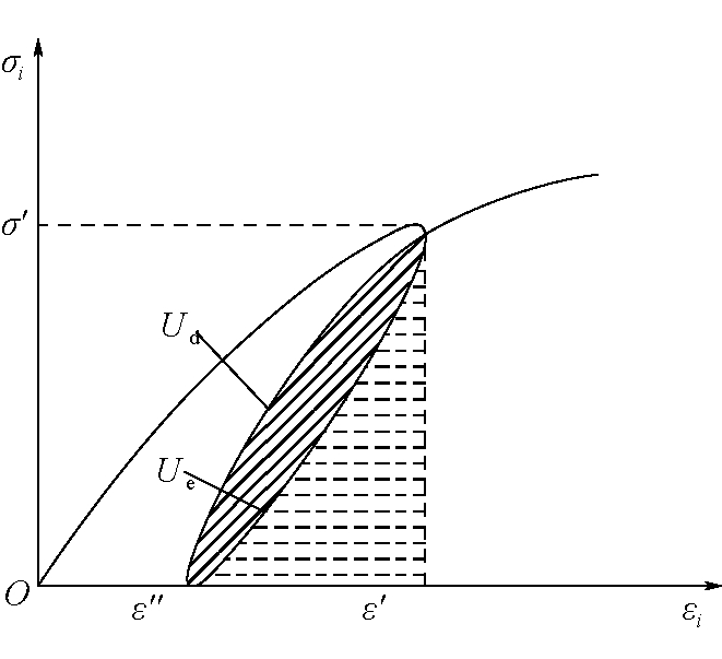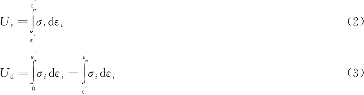 图1 受载煤体能量计算示意 加载过程中煤体内部微裂纹、损伤、摩擦热能等状态的发展归结于单元耗散能,且其具有单向不可逆性;剩余能量则储存于煤体内部,待达到煤体储能极限后突然或快速释放,引发煤体的灾变破坏。 依据弹性能可逆的特点,在实验中采用加卸载应力-应变曲线计算耗散能和可释放弹性应变能,认为加载过程中某一应力水平内曲线下方面积为输入的总能量,卸载曲线下方面积为积蓄在煤体中的弹性应变能,总能量减去弹性应用能则为耗散能,单元耗散能Ud与单元可释放弹性应变能Ue的计算公式为: