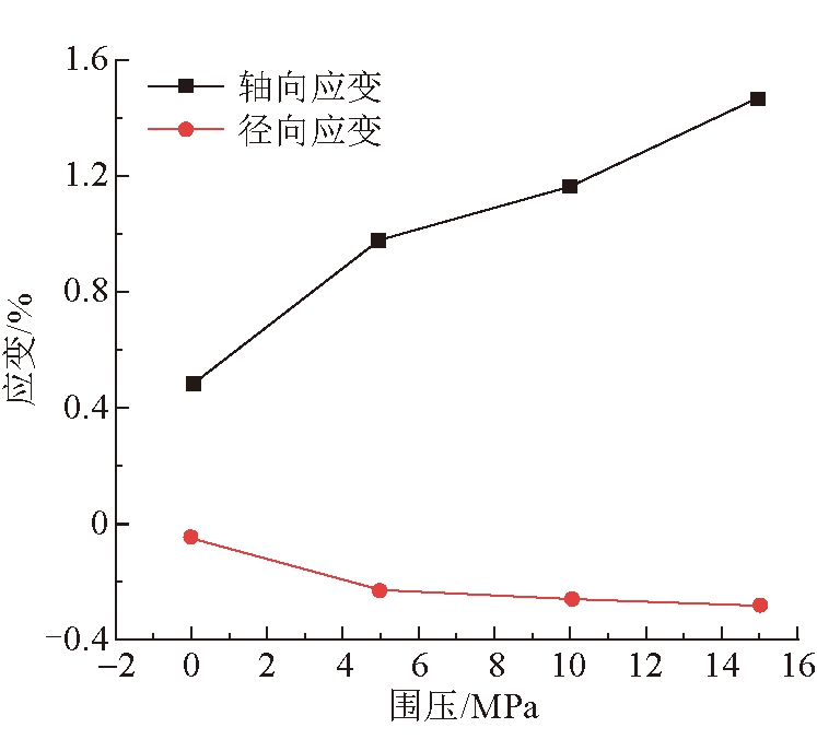 图5 围压-峰值强度曲线 3.3 扩容特性轴向与径向应变可以反映煤体受力状态下的扩容特性,围压-应变曲线如图6所示。由图6可以看出,随着围压的增加,轴向与径向应变均增大,围压的约束作用使径向应变增长幅度小于轴向应变;定义轴向应变与径向应变的比值为轴径比,在三轴状态下,围压由5 MPa增加到10 MPa,轴径比提高了5.4%,围压由10 MPa增加到15 MPa,轴径比提高了14.3%,表明煤体耗散能增长速率变低,弹性应用能增长速率提高。