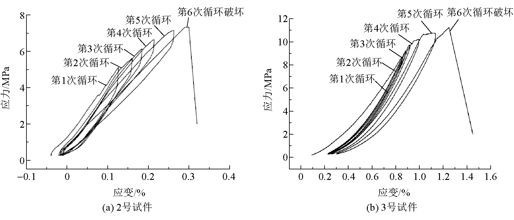 图6 围压-应变曲线 4 单轴加卸载实验4.1 全应力-应变曲线在单轴加卸载实验中,由于4个试样的加载方式相同,又考虑到不同试样的差异性,选取2个试件进行分析,循环加卸载作用下全应力-应变曲线如图7所示。由图7可以看出,当加载至总应力的75%时再卸载,卸载曲线未沿着原有加载路径返回,而位于加载曲线下方。分析认为,加载过程中,伺服机输入的总能量一部分以摩擦热能、损伤变性等耗散能的形式细观表现,另一部分以弹性应变能积聚于试件中,达到其储能极限后瞬间释放。加卸载曲线外包络线与单轴加载应力应变曲线相比,其弱化阶段(也称非弹性变形阶段)占比较大。