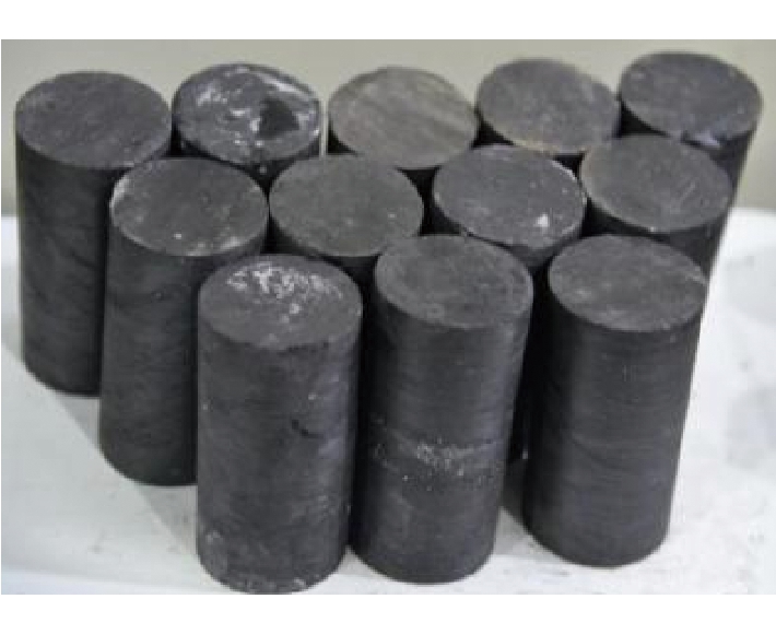 本文利用煤体的常规三轴及单轴加卸载实验探究煤体受载过程中力学特性及内部能量的演化。 2 研究区概况与实验方案试件取自布尔台煤矿4-2号煤层,煤层平均煤厚6.53 m,倾角3°~9°,埋深380~460 m,顶底板均为粉砂岩。根据布尔台煤矿地应力实测结果,最大主应力σ1为9.43 MPa,平均方位角为NE66°,垂直主应力7.5 MPa,水平主应力超过垂直主应力,考虑到构造应力具有明显的方向性,故其影响下,巷道及采场的矿山压力显现可能会随方向的不同而存在较大差异。 为保证试件环境赋存条件及内部裂隙发育相似,取相同巷道同一位置处较大块体后,在实验室加工成Φ50 mm×100 mm标准试件,两端不平行度小于0.05 mm,直径偏差小于0.3 mm,三轴加载实验每组3个试件,共4组,单轴加卸载实验共4个试件,煤样标准试件如图2所示。