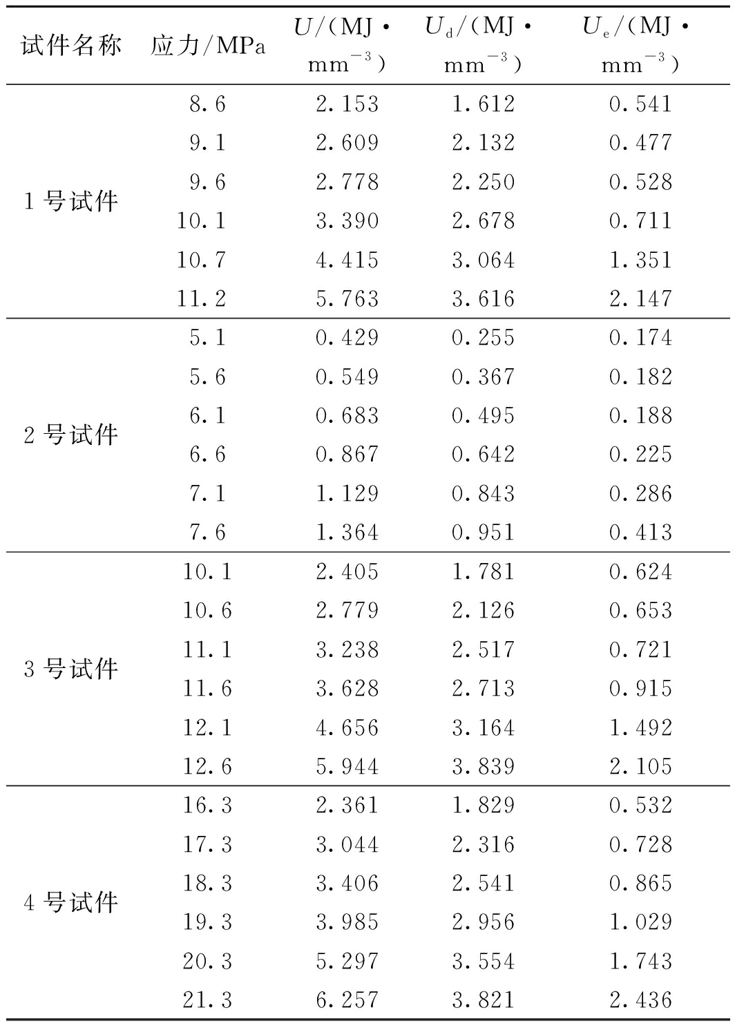 图7 循环加卸载作用下全应力-应变曲线 4.2 能量非线性演化特征依据实验曲线及式(1)~(3),得到4个试件的总输入能量U、耗散能度Ue和弹性应变能度Ud,见表1。 表1 不同应力下能量密度(1~4号试件)