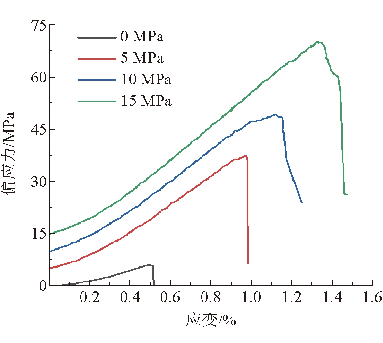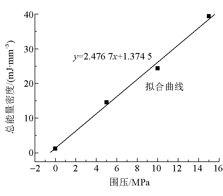 图2 煤样标准试件 实验采取三轴加载及单轴加卸载2种加载方式,三轴加载围压分别为0、5、10、15 MPa,加载至固定围压后,施加轴压直至试件破坏;单轴加卸载实验先加载至煤体峰值应力的60%,然后以每次循环增加0.5 MPa的应力进行加卸载,直至试件破坏,两种实验均使用位移加载的方式施加轴压,加载速度为0.02 mm/s,轴向和径向应变测量采用LVDT位移传感器,同时记录相关物理量。 3 三轴加载实验3.1 煤体变形力学特性规律不同围压下全应力-应变曲线如图3所示。由图3可知,围压的增加,增强了煤体的侧向约束能力,引起其弹性变形、强度弱化2个阶段应力的大幅增长,围压增高过程中煤体内部原有微裂纹已逐步被压密,导致压密阶段在常规三轴应力状态下表现不显著。围压较低时,破坏灾变阶段应力跌落迅速,围压较高时,此阶段应力跌落趋于缓和,这是由于较低围压下侧向约束较小,且单轴状态下试件具有充足的临空面释放能量。围压越大,内部存储的弹性应变能越多,试件破坏所需的能量也越大,在高围压下具有充足的临空面时,会引发较大规模的冲击地压现象,这与大埋深、高地应力地质条件下发生冲击地压概率越大的理论相吻合。通过计算不同围压下外界输入煤体的总能量密度,拟合出围压和总能量密度呈一次函数关系,函数关系式为y=2.476 7x+1.374 5。围压-总能量密度变化曲线如图4所示。