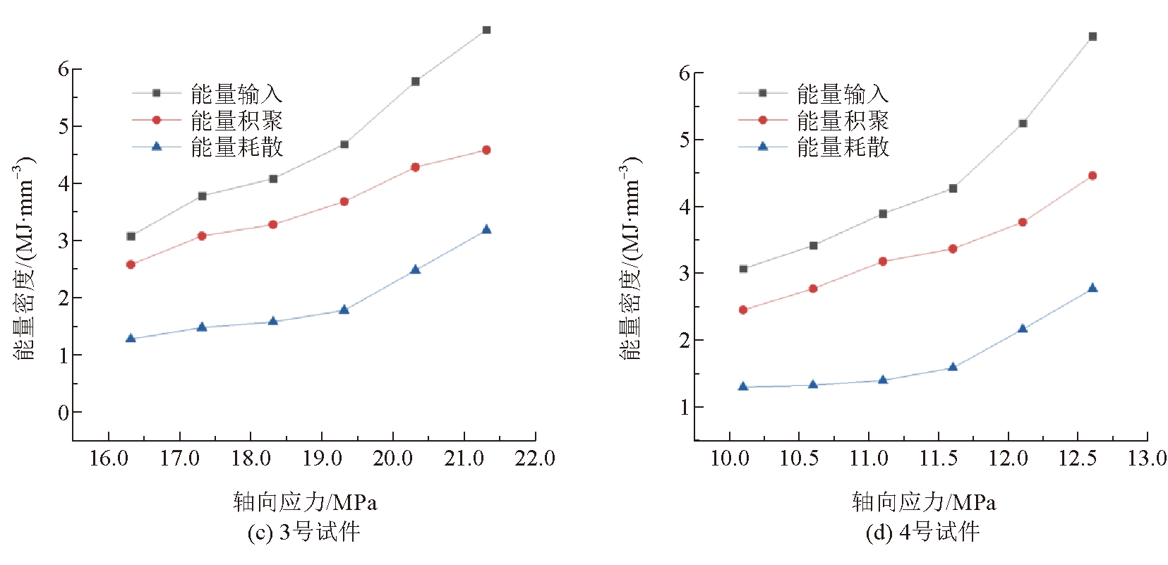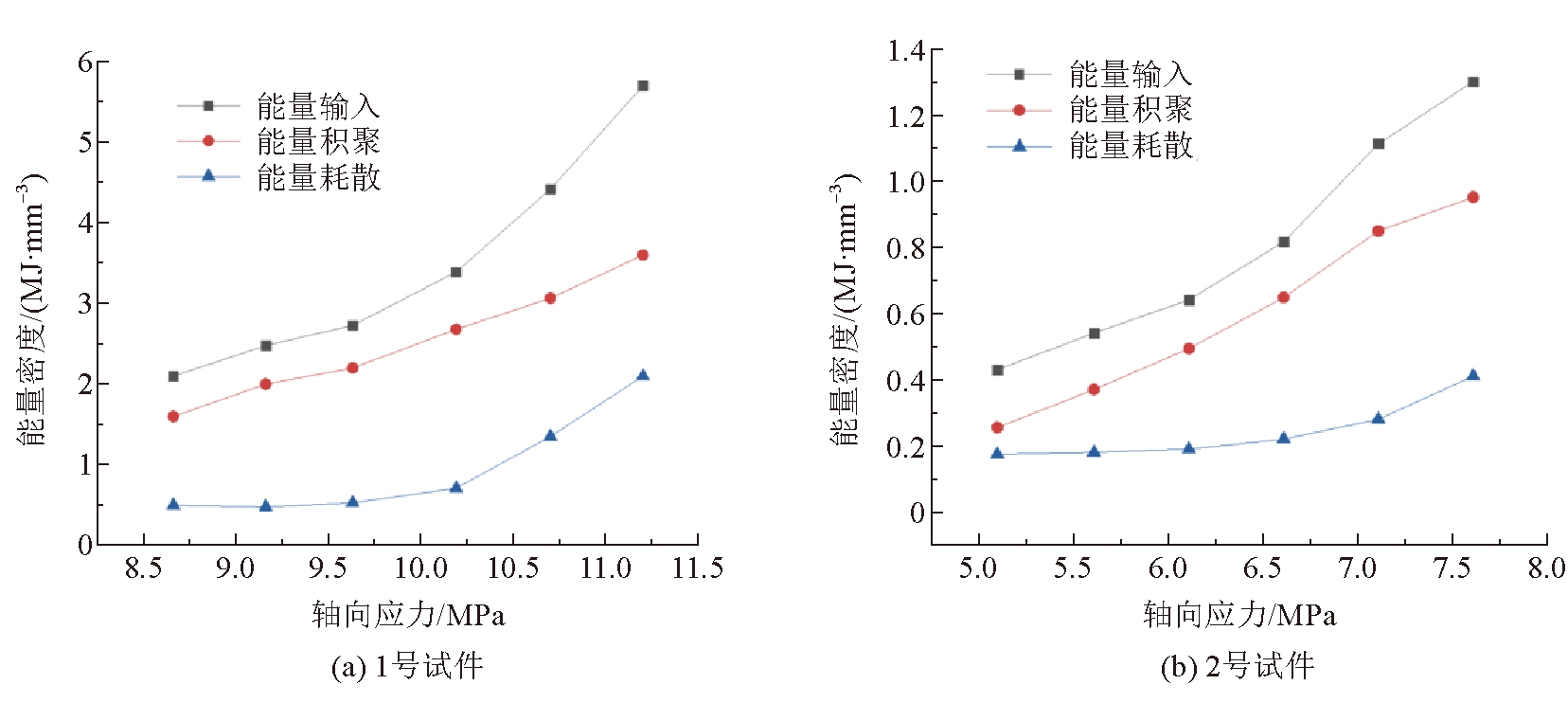 试件名称应力/MPaU/(MJ·mm-3)Ud/(MJ·mm-3)Ue/(MJ·mm-3)1号试件8.62.1531.6120.5419.12.6092.1320.4779.62.7782.2500.52810.13.3902.6780.71110.74.4153.0641.35111.25.7633.6162.1472号试件5.10.4290.2550.1745.60.5490.3670.1826.10.6830.4950.1886.60.8670.6420.2257.11.1290.8430.2867.61.3640.9510.4133号试件10.12.4051.7810.62410.62.7792.1260.65311.13.2382.5170.72111.63.6282.7130.91512.14.6563.1641.49212.65.9443.8392.1054号试件16.32.3611.8290.53217.33.0442.3160.72818.33.4062.5410.86519.33.9852.9561.02920.35.2973.5541.74321.36.2573.8212.436 根据表1相关数据,得到加载过程中试件内部能量演化规律,如图8所示。由图8可知,加载初期弹性应变能增长9%~13%,耗散能增长4%~6%,增长均较缓慢,这是由于试件在前期加载过程中内部裂隙已被压密,进入弹性阶段,此阶段旧裂缝已闭合、新裂缝未产生,能量稳定增长;随着外界能量的持续输入,总能量占比达50.7%,弹性应变能及耗散能增长速率加快,分别占总能量的70%及30%;试件进入弱化阶段,此阶段新裂纹产生且有贯通趋势,弹性应变能增速减缓约29.6%,耗散能增速加快约42.4%;达到应力峰值时,耗散能速率达到峰值,弹性应变能总量达到最大,随后开始释放,试件发生宏观破坏。