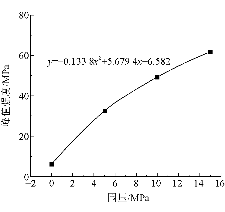 图4 围压-总能量密度变化曲线 3.2 强度特性深部煤层在高地应力作用下发生冲击地压的概率远大于浅部煤层,围压-峰值强度曲线如图5所示。由图5可以看出,围压与峰值强度呈二次抛物线关系(y=-0.133 8x2+5.679 4x+6.582),围压的存在能够有效提高煤体的峰值强度,但不会无限制的提高,随着围压的持续增加峰值增长速率逐渐放缓,峰值增大的同时煤体内部会积聚更多的弹性应变能,在具有冲击倾向性煤体的本质特性作用下,极易发生规模较大的冲击地压。