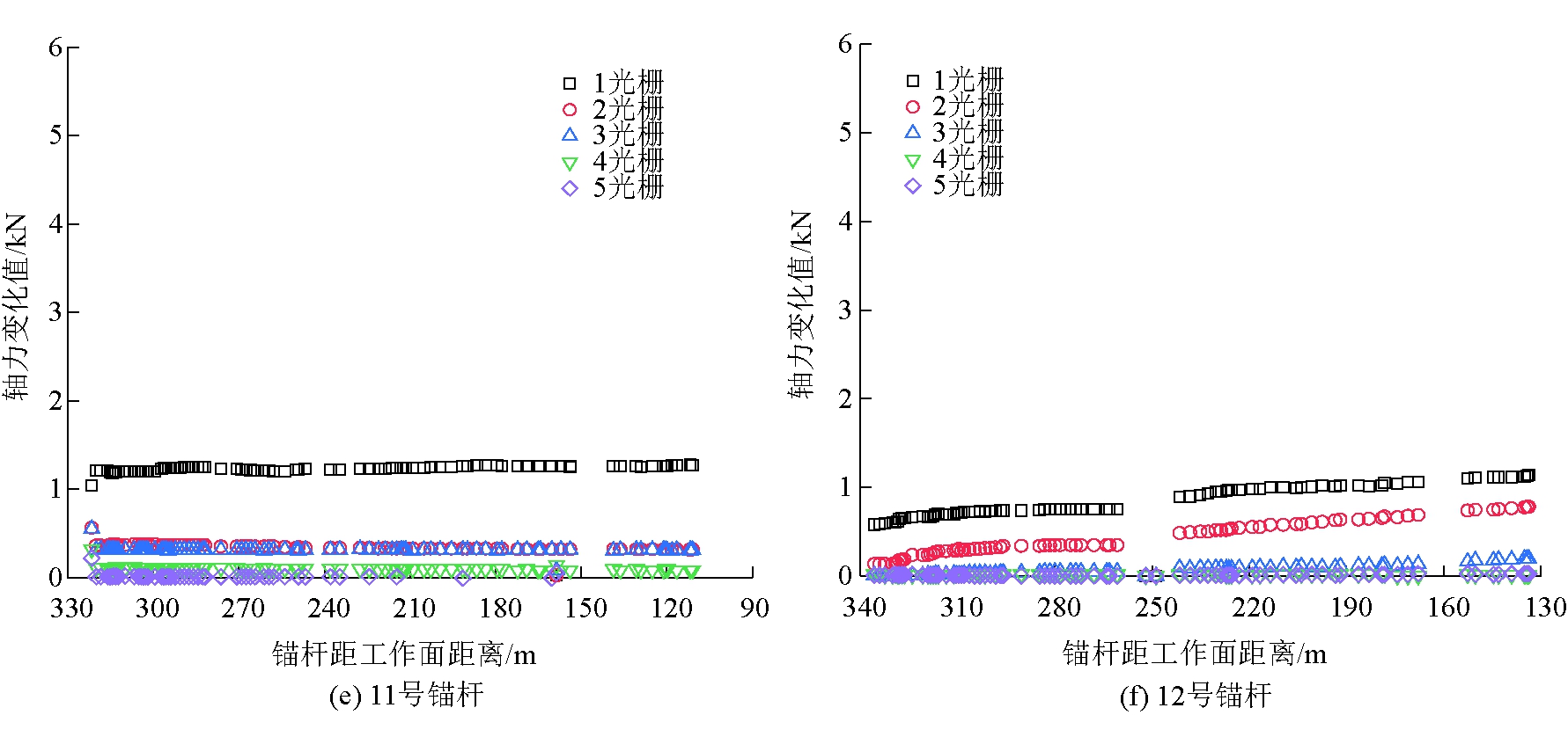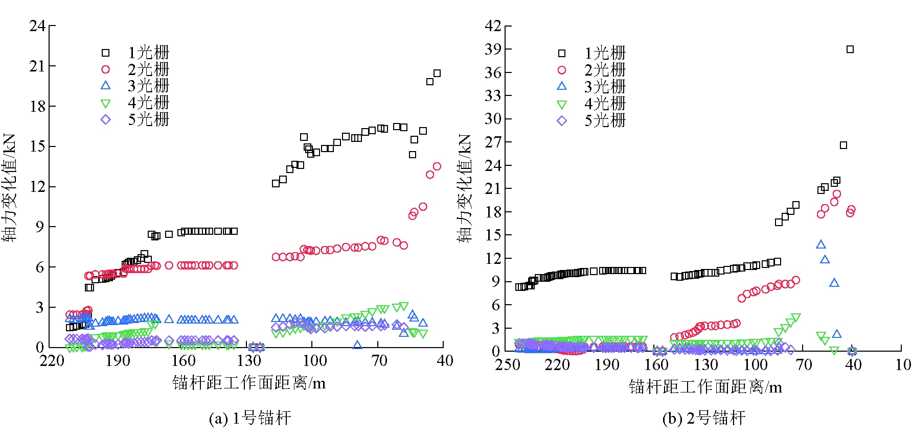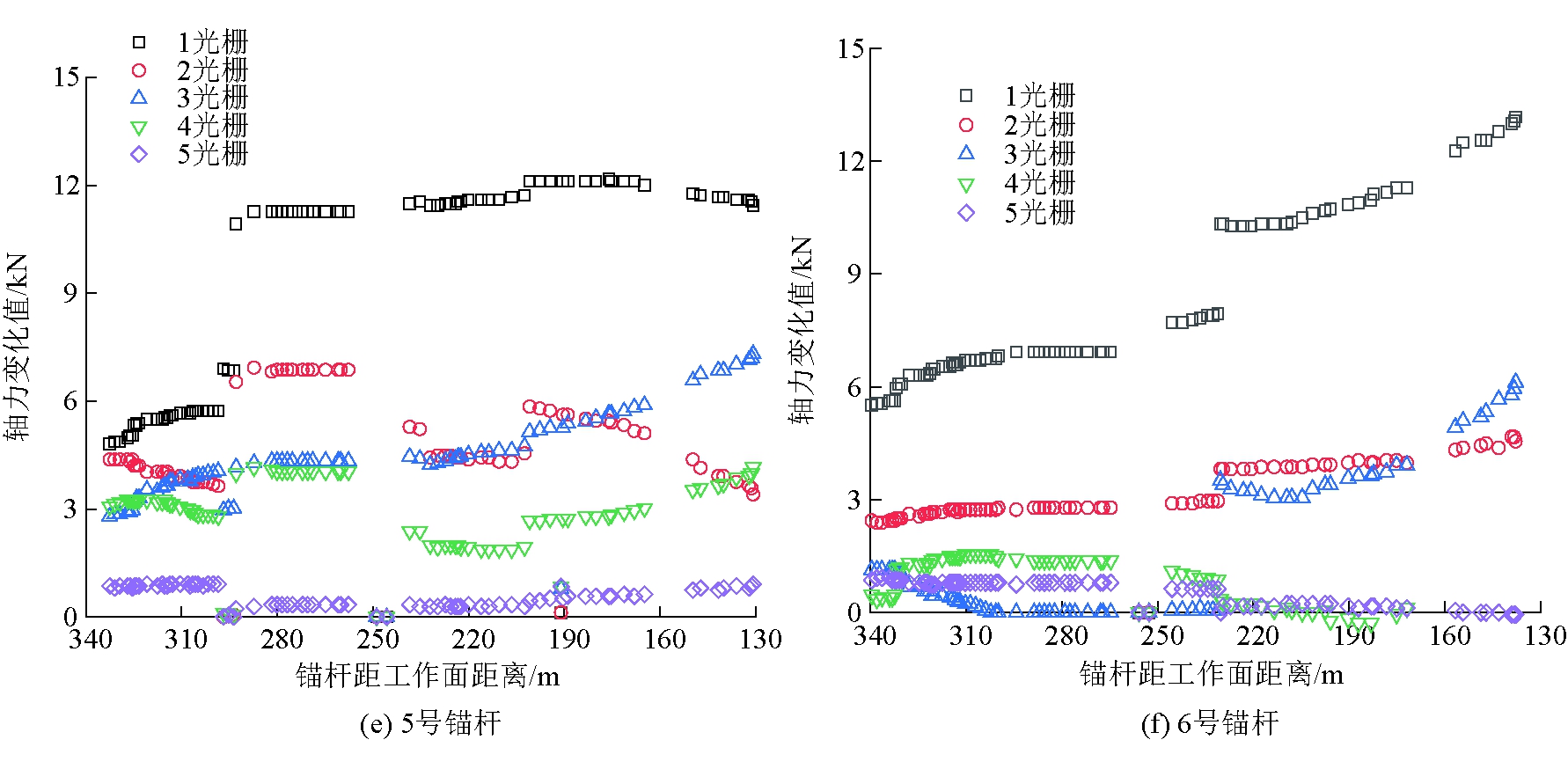 图4 锚杆安装位置 3 锚杆杆体受力和变形特征3.1 监测结果分析由于井下巷道温度相对恒定,锚杆埋入围岩后温度基本稳定,温度对传感器影响可忽略不计。 在1根2.2 m的锚杆上,将FBG传感器以380 mm的间距依次布置及编号。为方便分析,从外露端向锚固端进行编号,托盘段为1号光栅,锚固段为5号光栅。数据收集至1号锚杆失效,从而对比分析各个锚杆的安全状态。锚杆各位置的轴力随工作面推进可以由FBG传感器准确地反映出来,左帮锚杆轴向应力监测曲线如图5所示。 从图5可以看出,左帮锚杆轴向应力总体变化趋势相同,锚杆杆体的轴力变化明显,其中1号光栅数据变化最为明显。工作面在推进过程中,锚杆轴力是逐渐增加的,工作面与1号、2号锚杆最近,两根锚杆总体变化趋势相似,采动对两者的影响相对更大;相比之下较远的3号、4号、5号、6号锚杆轴力变化量更小。可将图5(a)和(b)中情况分为缓慢增长区和快速增长区,在工作面推进到距锚杆60 m之前位置时锚杆轴力缓慢增加,工作面推进到距锚杆60 m之后位置时锚杆轴力迅速增加;而相对较远的3号、4号、5号、6号锚杆轴力缓慢增加,并较为稳定;托盘附近的光栅传感器相比锚固段杆体内的光栅传感器所监测到的轴力更大,且轴力变化值也相对较大。