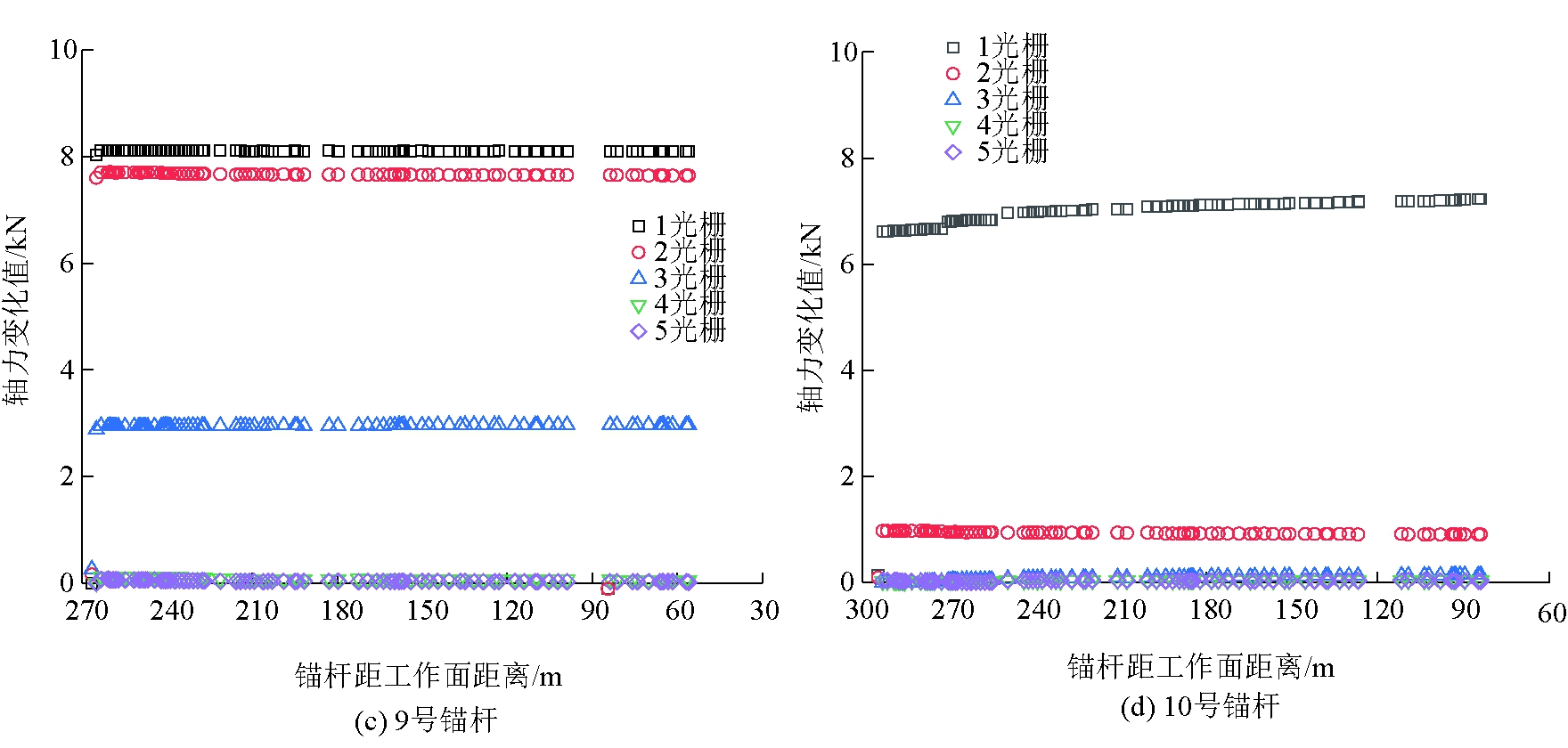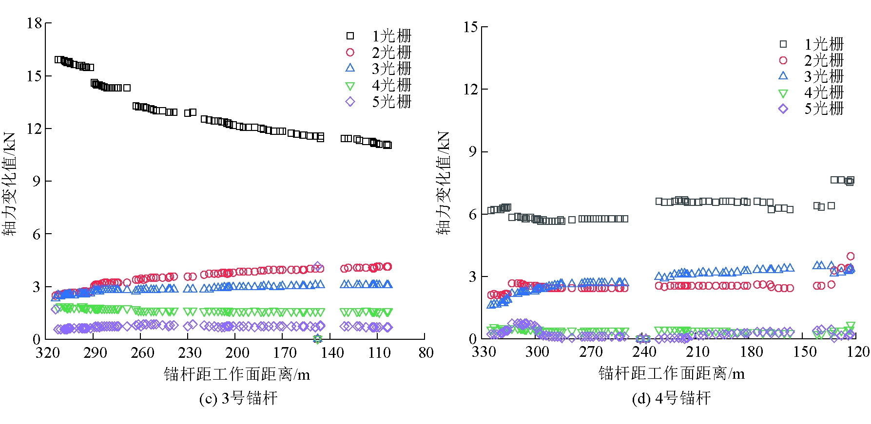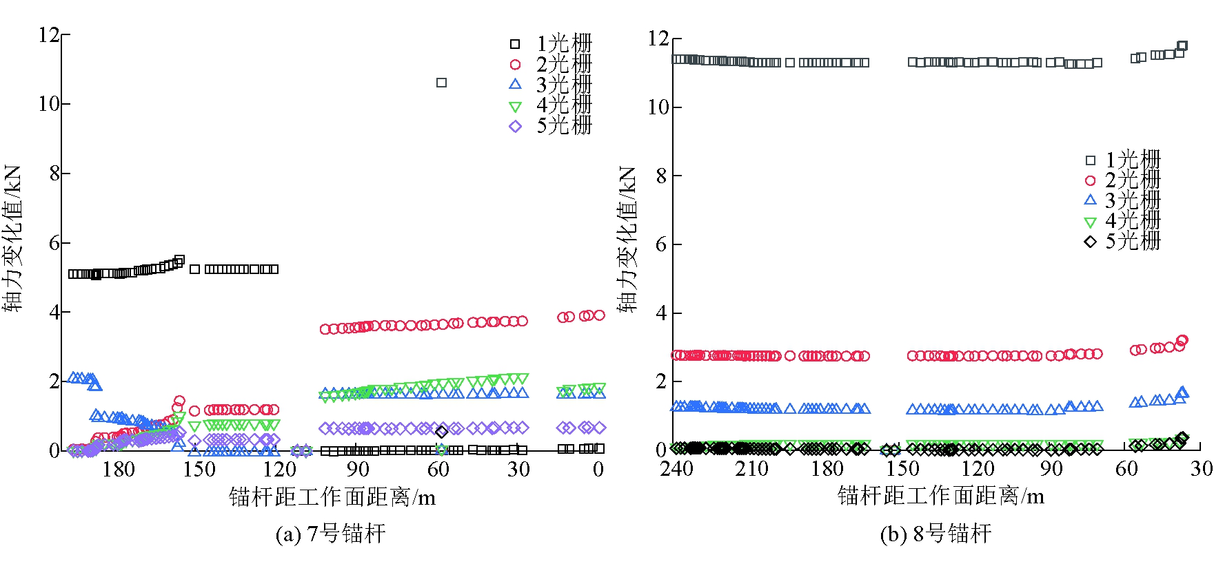 图4 锚杆安装位置 3 锚杆杆体受力和变形特征3.1 监测结果分析由于井下巷道温度相对恒定,锚杆埋入围岩后温度基本稳定,温度对传感器影响可忽略不计。 在1根2.2 m的锚杆上,将FBG传感器以380 mm的间距依次布置及编号。为方便分析,从外露端向锚固端进行编号,托盘段为1号光栅,锚固段为5号光栅。数据收集至1号锚杆失效,从而对比分析各个锚杆的安全状态。锚杆各位置的轴力随工作面推进可以由FBG传感器准确地反映出来,左帮锚杆轴向应力监测曲线如图5所示。 从图5可以看出,左帮锚杆轴向应力总体变化趋势相同,锚杆杆体的轴力变化明显,其中1号光栅数据变化最为明显。工作面在推进过程中,锚杆轴力是逐渐增加的,工作面与1号、2号锚杆最近,两根锚杆总体变化趋势相似,采动对两者的影响相对更大;相比之下较远的3号、4号、5号、6号锚杆轴力变化量更小。可将图5(a)和(b)中情况分为缓慢增长区和快速增长区,在工作面推进到距锚杆60 m之前位置时锚杆轴力缓慢增加,工作面推进到距锚杆60 m之后位置时锚杆轴力迅速增加;而相对较远的3号、4号、5号、6号锚杆轴力缓慢增加,并较为稳定;托盘附近的光栅传感器相比锚固段杆体内的光栅传感器所监测到的轴力更大,且轴力变化值也相对较大。