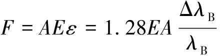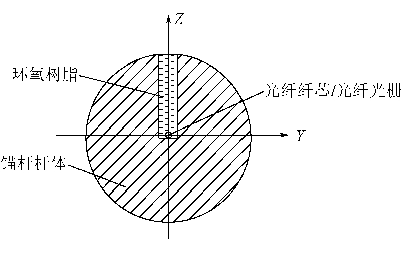 图1 锚杆FBG传感器结构布置 FBG传感器横截面如图2所示,FBG传感器由锚杆杆体、环氧树脂和FBG 3部分组成。 为了防止传感器在运输过程中出现意外,采用热塑管进行密封。在锚杆连接位置和尾纤处用塑料泡沫进行包裹,防止在运输过程中损坏传感器。 2.4 锚杆增量弹性模量锚杆的轴向力可以表示为: (5) 式中:F——锚杆轴向力,N; E——锚杆弹性模量,MPa; A——锚杆截面积,m2。 当锚杆的轴力不大时,其截面积的变化也很小,可以忽略不计。因此,可以认为A是常数。锚杆材料确定后,其弹性模量E不变。