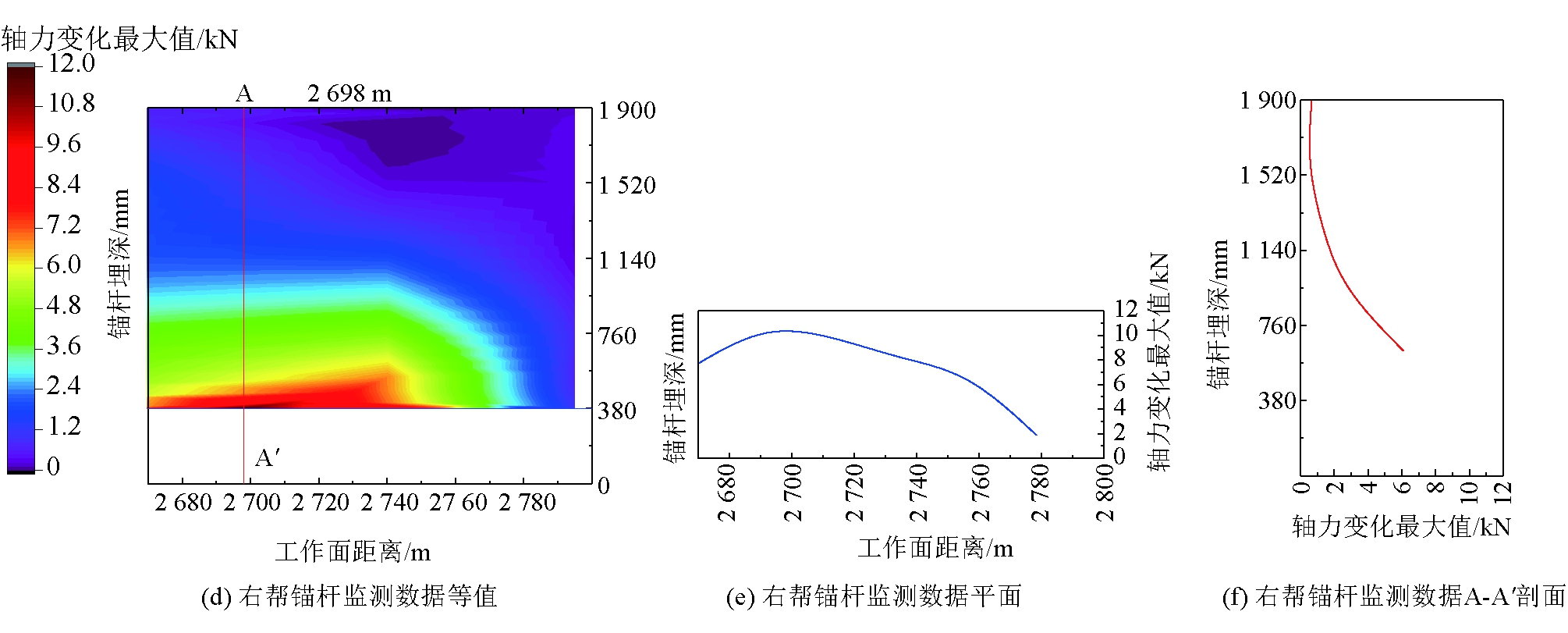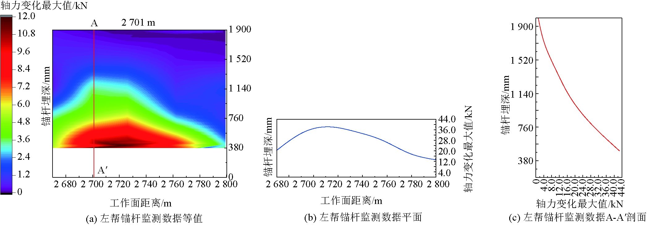 图7 锚杆监测数据等值与剖面曲线 从图7可以看出,在回采巷道左帮2 700~2 740 m 处锚杆所受轴力最大,同时在这个范围内右帮也承受到最大轴力,也是巷道围岩发生冒顶破坏危害最大的位置,在工作面回采时需要对这个位置特殊关注。 在沿工作面回采方向,由于锚杆埋深0~380 mm是自由段,不需考虑其轴力大小。锚杆埋深越深,锚杆最大轴力越小。这是由于锚杆埋深深处为锚固段,与围岩相对契合,随岩体变形移动,因而轴力变化较小;锚杆埋深浅处为自由段,杆体靠近托盘处,能够自由变形,因而轴力变化较大。左、右帮锚杆相比,左帮锚杆轴力变化更为明显,轴力变化值普遍大于右帮锚杆。邻近工作面的巷帮位置受采动影响的距离最短,采动影响比其他位置更为直接。 4 结论(1)在煤矿应用FBG传感器锚杆轴向应力监测试验中,左帮锚杆轴力变化最明显,轴力变化值普遍大于右帮锚杆,邻近工作面的巷帮位置受采动影响的距离最短,采动影响比其他位置更为直接。 (2)综采工作面推进过程中,锚杆左帮将工作面推进到距锚杆60 m之前锚杆轴力缓慢增长,工作面推进到距锚杆60 m之后锚杆轴力快速增长。锚杆右帮轴力随工作面推进皆呈缓慢增长。 (3)根据井下巷道锚杆轴力监测数据,锚固段杆体由于相对契合围岩,轴力变化幅度均较小;近托盘处杆体由于位于自由段,能够自由变形,轴力变化幅度均较大;锚杆轴力沿自由段杆体分布不均匀,靠近托盘处杆体的轴力最大。 (4)FBG锚杆监测数据插值平滑处理后得到连续分布等高剖面曲线,通过对比各个位置上锚杆轴力最大值分布,可以分析出受采动影响最大的巷道位置,在该位置应及时采取锚杆支护防治措施以预防锚杆破断等事故发生。 [1] 康红普.我国煤矿巷道锚杆支护技术发展60年及展望[J].中国矿业大学学报,2016,45(6):1071-1081. [2] 陈长华,崔强.典型浅埋煤层回采巷道锚杆支护特性研究[J].煤炭科学技术,2018,46(S1):12-17. [3] LI Yanhui,LIU Limin,SUN Jiaxin,et al. Research on support of deformation of mining side gob along high-stress mining roadway[J]. Geotechnical and Geological Engineering,2019,37(6):5543-5553. [4] CUI Feng ,DONG Shuai ,LAI Xingping,et al. Study on the fracture law of inclined hard roof and surrounding rock control of mining roadway in longwall mining face[J]. Energies,2020,13(20):5344-5344. [5] JIA Housheng,PAN Kun,LIU Shaowei ,et al. Evaluation of the mechanical instability of mining roadway overburden:research and applications[J]. Energies,2019,12(22):4265-4283. [6] JIA Guangkan,ZHANG Nong,ZHANG Haiwei,et al. Stress evolution and deformation control technology for deep mining influenced roadway[J]. Applied Mechanics and Materials,2011,90-93(1446):137-145. [7] WANG Pu,JIANG Lishuai,MA Changqing,et al. Evolution laws of floor stress and stability of floor roadway affected by overhead mining[J]. Earth Sciences Research Journal,2020,24(1):45-54. [8] LI Guodong,CAO Shugang,LUO Feng,et al. Research on mining-induced deformation and stress,insights from physical modeling and theoretical analysis[J]. Arabian Journal of Geosciences,2018,11(5):1-9 [9] 王傲,姚强岭,李学华,等.采动高应力区沿空掘巷锚杆破断机理[J].中国矿业大学学报,2017,46(4):769-775. [10] 余伟健,李可,张靖,等.采动影响下深埋软岩巷道变形特征与控制因素分析[J].煤炭科学技术,2020,48(1):125-135. [11] 李臣,张文龙,汪宁,等.基于采动影响下塑性区演化的顶板稳定性控制[J].采矿与安全工程学报,2019,36(4):753-761. [12] 汪文勇,高明忠,王满,等.深埋沿空留巷采动变形特征及应力分布规律探索[J].岩石力学与工程学报,2019,38(S1):2955-2963. [13] 陈彦龙,张后全,吴宇,等.采动矿压与锚杆轴力变化关系的实测研究[J].煤炭学报,2016,41(5):1106-1110. Research on safety status monitoring of anchor bolts in mining roadway under the influence of mining