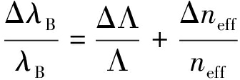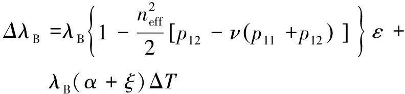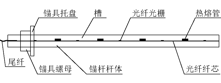 (2) 式中:pij——弹光系数; ΔλB——光栅波长漂移量; ε——应变; neff——有效折射率; ν——泊松比; α——热膨胀系数; ζ——热光系数; ΔT——温度变化,℃。 2.2 光纤光栅应变测量当光纤光栅仅受应力作用时: (3) 式中:Δneff——折射率的变化量; ΔΛ——光栅周期的变化量。 在恒温环境下,光纤光栅应变的测量公式为: (4) 式中:Pe——有效弹光系数。 计算得出所用光纤其值为0.22。 2.3 FBG锚杆设计在直径18 mm螺纹钢锚杆和直径32 mm玻璃钢锚杆上加工宽2 mm、深度9 mm和16 mm的细小沟槽,将FBG传感器紧密粘贴在槽底,在锚杆内布置好并封装,在尾部引出铠装光缆,连接FBG调制解调仪进行实时监测。锚杆FBG传感器结构布置如图1所示。