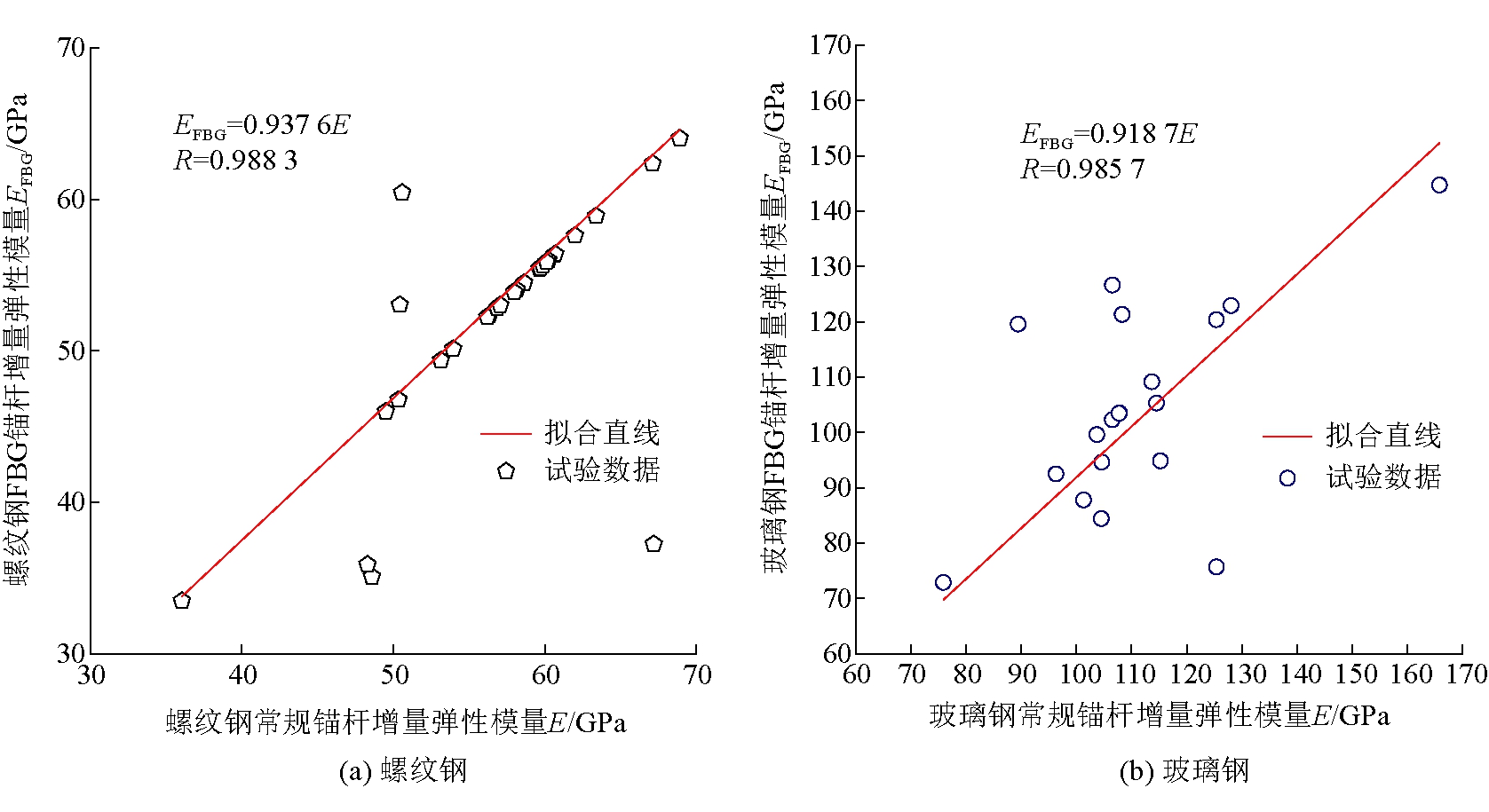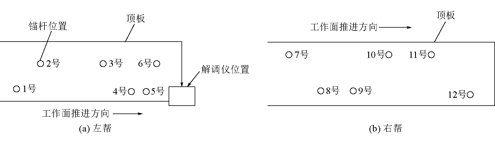 图2 FBG传感器埋入结构后的横截面示意 通过恒温恒速加载,在电液伺服万能实验机上分别拉伸常规玻璃钢锚杆、螺纹钢锚杆和FBG玻璃钢锚杆和FBG螺纹钢锚杆。由实验测得的FBG传感器中心波长变化数据,绘制常规和FBG锚杆增量弹性模量关系曲线如图3所示。 在锚杆拉伸后且未发生屈服之前的弹性变形阶段,轴力变化增量值与应变增量值的比值为锚杆杆体的增量弹性模量,从图4中实验数据的分布情况可以看出,螺纹钢常规锚杆和FBG锚杆增量弹性模量呈现出很好的一致性,符合弹性变形阶段弹性模量基本保持一致的材料力学属性。计算得到螺纹钢常规锚杆和FBG锚杆的增量弹性模量的平均值分别为54.2、50.4 GPa,玻璃钢常规锚杆和FBG锚杆的增量弹性模量的平均值分别为112.2、107.7 GPa,强度损失皆满足井下实际需求,实验结果也验证了FBG锚杆传感器监测锚杆轴力状态的可靠性。 2.5 监测传感器安装由顶板周期来压引发的锚杆破坏主要集中在运输巷和辅运巷的两帮。 工作面周期来压步距最大为15 m,监测周期来压范围内巷道支护锚杆受力变形与工作面推进过程中矿压之间的规律,确定光纤光栅传感器锚杆需布置在工作面前方大概225 m范围内。在巷道围岩左、右帮共打入12根锚杆,左帮布置玻璃钢锚杆、右帮布置螺纹钢锚杆各6根,如图4所示。 左右帮侧由于存在井下设施的干扰,可根据现场对左右帮光纤光栅锚杆位置做出调整。围岩巷道受力情况的监测是一个持久且缓慢的过程,为了使监测数据更加精准,需要每天在同一时间下井,记录井下实时情况,保证外界环境的一致性,实时准确地获取锚杆数据。 由于锚杆打入是靠人工用手抱钻方式打孔,打孔后用搅拌锚杆将锚固树脂搅匀,随后将光纤光栅锚杆打入。在锚杆打入巷道后,将每帮侧锚杆用型号为MGTS-12B矿用单模光缆进行连接,同时将矿用光缆布设至解调仪附近,汇至集线盒中。
