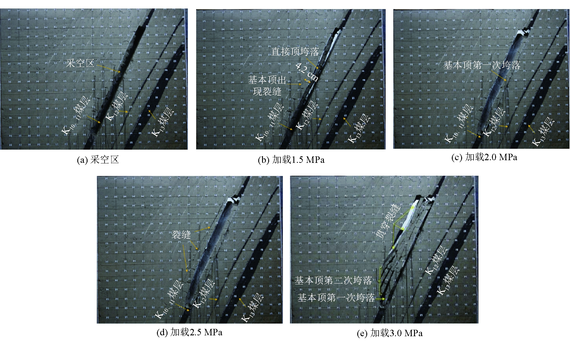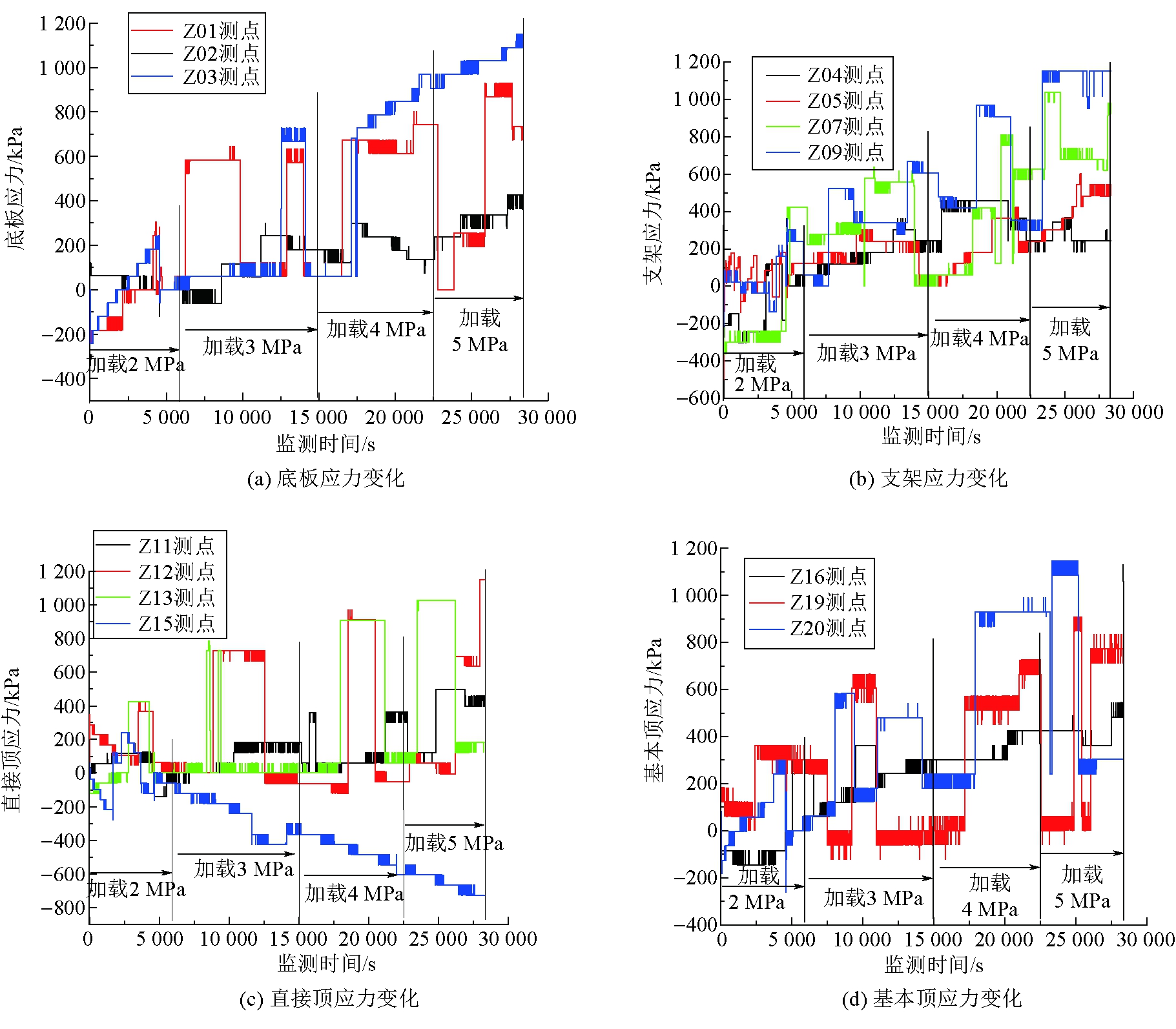 序号名称厚度/cm密度/(kg·m-3)配比号分层干重/kg河沙/kg石膏/kg水泥/kg水/kg1中粒砂岩152.01 580773945.61827.4182.7435.46105.072泥岩1.01 5508648.697.730.580.390.973K10煤层3.61 11043722.4117.931.343.142.494泥岩1.01 5508648.697.730.580.390.975K11煤层3.41 11043721.1716.931.272.962.356泥岩1.41 55086412.1710.820.810.541.357细粉砂岩24.01 640973214.97193.4715.056.4523.898泥岩1.61 5508648.007.110.530.360.899K12煤层1.81 0503378.546.840.641.500.9510细粉砂岩10.01 64097369.5362.584.872.097.7311泥岩1.21 5508647.216.410.480.320.8012K13煤层6.01 01043722.1216.591.663.872.4613细粉砂岩56.01 640973157.66141.9011.044.7317.52 2.3 测试内容模型铺设完成后自然风干15 d,按工作面实际埋深(埋深300 m)在模型顶部用千斤顶施加荷载,根据应力相似比计算,模型施加的垂直应力为0.094 MPa,模型面积为0.6 m2,则千斤顶加载力为56.4 kN。先进行顶板、支架、底板应力监测实验,监测到压力盒数据稳定后再停止,分析煤层、岩层的应力分布特征;然后取出支架,模拟工作面推进过程中顶板的破断规律,采用数字摄影测量技术观测上覆岩层破坏过程,同时监测底板应力,分析底板K12、K13煤层巷道在高应力区、低应力区、原岩应力区的应力。 3 监测结果分析3.1 应力监测结果分析煤层、顶板、底板的应力监测点结果如图4所示。 由图4(a)可知,在模型顶部施加的垂直应力从2 MPa增长到5 MPa过程中,3个监测点的应力先增后降,都经历了一次加卸载过程,总体呈现上升趋势;在煤层倾斜方向上,最上部Z01测点应力峰值最大,中间位置的Z02测点应力峰值最小;模型施加应力3 MPa时,底板最大受力727.97 kPa,最小受力300.45 kPa。 由图4(b)可知,在施加的垂直应力增加过程中,支架上的4个监测点都经历了应力的加卸载过程,但总体呈上升规律,其中Z09监测点应力最大,模型施加应力3 MPa时,支架最大受力668.47 kPa,因支架刚度很大,支架的应力高于底板。 由图4(c)可知,直接顶应力在监测时间内,应力大致呈现升高趋势;在施加应力3 MPa时,应力变化为先增加后下降,最后稳定不变,经历了应力的加卸载过程,其中Z12监测点应力峰值最大达729.3 kPa。 由图4(d)可知,基本顶的3个监测点在各个阶段监测时间内,都经历了应力的加卸载过程,在施加应力3 MPa时,Z19监测点应力峰值最大达665.36 kPa。 因此,从应力监测结果分析可知,煤层开采后,在煤层倾斜方向及法线方向上,采动后应力分布从上往下大致呈现出依次降低的规律,说明应力在岩层中传播时,随岩层深度延深应力会逐渐减小。 3.2 覆岩断裂演化规律拆除模型中的支架,模拟采煤过程中顶板的断裂、运移特征。模拟煤层埋深300 m,即模型施加垂直应力3 MPa,荷载保持2 h,则覆岩破断演化特征如图5所示。