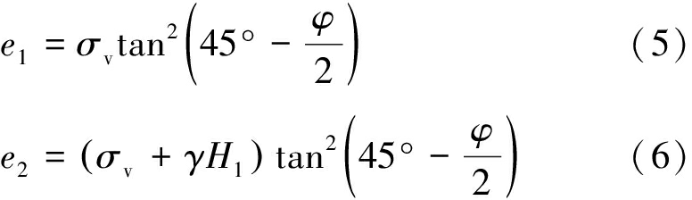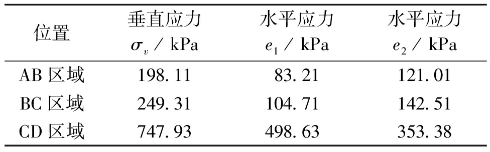式中:σv——巷道垂直压力,kPa; e1——巷道顶板的水平压力,kPa; e2——巷道底板的水平压力,kPa; e——自然常数; k——侧压力系数,取1.0~1.5; b1——延伸至地表破裂面宽的一半,m; γ——围岩容重,取25 kN/m3; φ——围岩内摩擦角,取24°; a——巷道半径,取2.1 m; h——巷道深度,m; H1——巷道开挖高度,取3.6 m。 K13煤层采区巷道各区域巷道围岩压力理论计算值见表3。AB区域处于采空区下方,此区域应力为煤层间距岩体的重量,hAB取50 m;BC区域为原岩应力区,此区域应力计算为上部岩层的原岩应力,hBC值取400 m;CD区域为高应力区,应力集中系数Kn=Kcos 60°,K值取8。