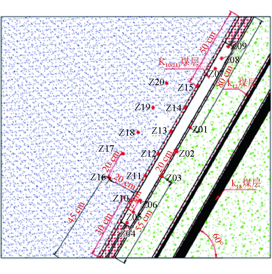 图2 31111综采工作面相似模拟模型 相似模拟几何相似比1∶50,容重相似比1∶1.56,应力相似比1∶78;时间相似比1∶7.07,煤岩体物理力学参数见表1。K10+K11煤层合采工作面中布置23个尺寸为20 cm×6 cm×8 cm(长×宽×高)的小型支架,模拟工作面开采,模型铺设过程中在工作面支架、直接顶、基本顶和直接底岩层中布置压力盒,监测顶底板及巷道周围应力变化。模拟在工作面回采过程中,为消除边界效应的影响,在模型中工作面上端头、下端头分别留设15 m的边界煤柱。 应力监测系统采用AMSD3-16高速静态应变仪和微型土压力盒,应力监测布置如图3所示。模型共布置20个应力测点,底板布置3个监测点,测点间距20 cm,依次编号Z01~Z03;煤层支架上布置 6个应力测点,测点间距12 cm,依次编号Z04~Z09;直接顶布置6个测点,测点间距20 cm,依次编号Z10~Z15;基本顶布置5个测点,测点间距20 cm,垂直直接顶上方20 cm高度布置,依次编号Z16~Z20,开挖过程中采用数字摄影测量技术观测上覆岩层破坏过程。
