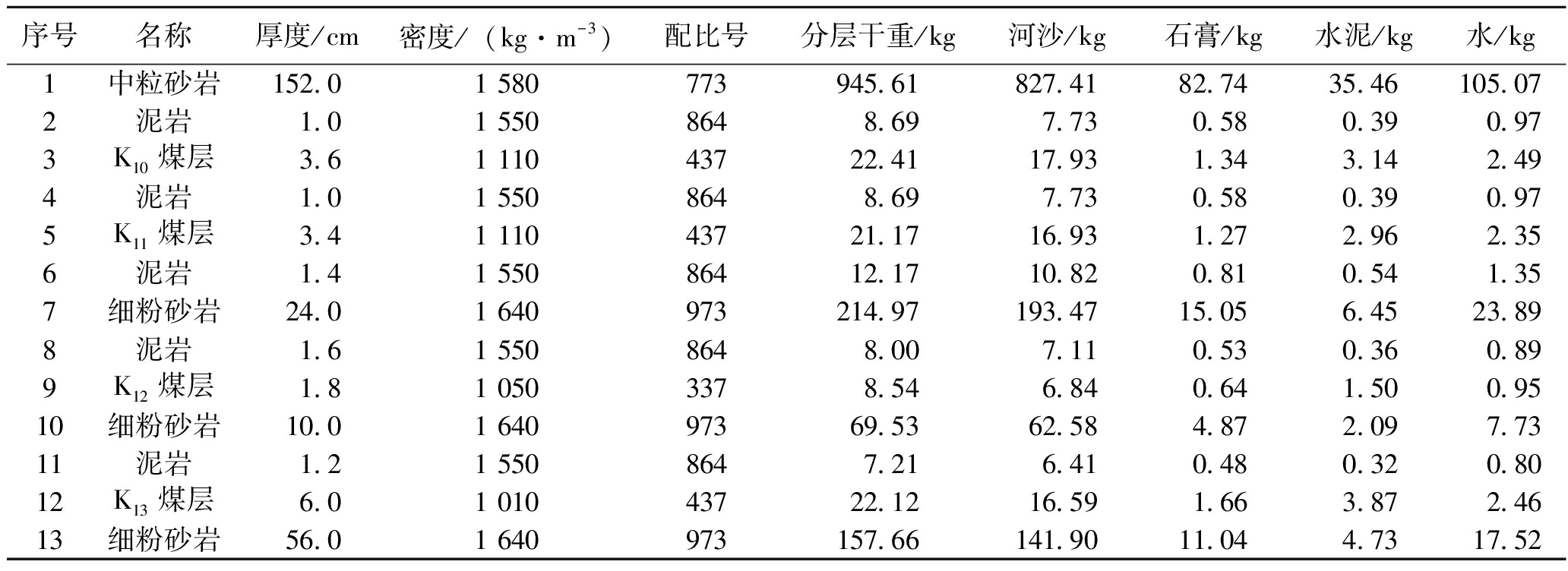 图3 模型应力监测布置 2.2 材料配比计算实验材料选用河沙为骨料,胶结材料选用石膏、碳酸钙,分层材料选用云母粉。单层材料湿重可通过式(1)计算: Gi=lbhiγi (1) 式中:Gi——模型中第i层的材料总湿重量,kg; l,b——模型的长、宽,m; hi——模型第i层的高度,m; γi——模型第i层的密度,kg/m3。 单层材料干重: G=Gi(1-q) (2) 式中:G——材料风干重量,kg; q——水胶比,即水重占总重的比,取10%。 按照模型相似比制定模型相似材料的配比,其材料配比见表2。 表2 模型顶、低板岩层材料配比