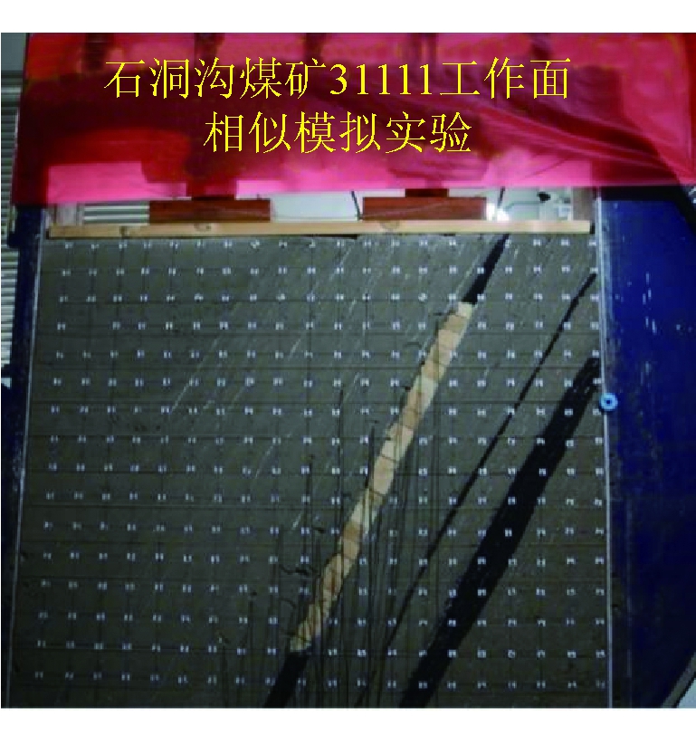 名称岩性厚度/m弹性模量E/GPa抗压强度σc/MPa内聚力C/MPa内摩擦角φ/(°)泊松比基本顶中粒砂岩3.80~7.5018.3047.526.537.50.24直接顶砂质泥岩0.30~0.755.5021.56.818.90.29伪顶砂质泥岩0.09~0.304.8223.66.119.00.28K10+K11煤层煤2.90~4.501.2613.45.410.00.32K12煤层煤0.90~1.101.3510.85.111.00.28K13煤层煤1.20~3.001.2311.35.412.00.31伪底砂质泥岩0.40~0.604.9122.66.719.00.28直接底细粉砂岩9.80~11.1018.1034.527.840.90.25 2 采用相似模拟实验进行覆岩破断规律研究2.1 模型搭建相似模拟设备为2.0 m×0.3 m×2.0 m的可旋转模型架,加载载荷200 t。实验以石洞沟煤矿31111综采工作面为原型,模拟煤层倾角60°,模型铺设长度2.0 m,高度1.8 m,模型选用1∶50的比例进行模拟,如图2所示。
