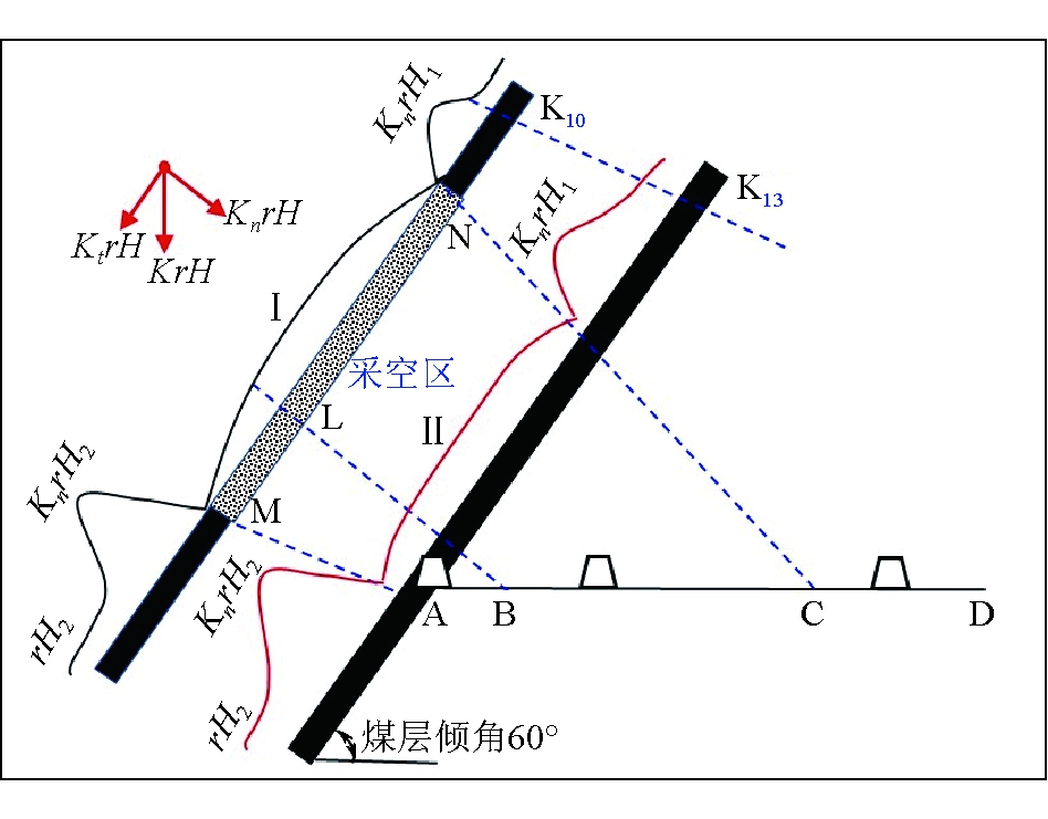 图4 各岩层监测点垂直应力变化曲线 由图5(a)可知,煤层开采后,无支护状态下,在施加垂直向下的恒定荷载1 MPa后30 min中内,直接顶岩层产生微小弯曲变形,但没有垮落,整体结构保持完整。 由图5(b)可知,在施加到1.5 MPa垂直应力时,直接顶岩层失稳,全部垮落,煤层倾斜方向垮落98 cm,垮落厚度1.4 cm,并在基本顶4.2 cm处出现宽0.26 cm的裂缝。 由图5(c)可知,在施加2 MPa垂直应力后,基本顶第一次垮落,垮落高度4.2 cm,煤层倾斜方向垮落131 cm。 由图5(d)可知,在施加2.5 MPa垂直应力后,在第一次垮落上方4.5 cm左右处出现2条裂缝,最宽处为0.34 cm,表明采动后上覆岩层受采动的影响还将继续向上扩展,上覆岩层也将发生更为剧烈的、更大范围的垮落。 由图5(e)可知,在施加3 MPa垂直应力后,基本顶发生了第二次垮落,上覆岩层产生了更大范围的断裂,总垮落高度8.7 cm左右,煤层倾斜方向垮落116 cm。表明在无支护状态下,工作面上方坚硬岩层将周期性垮落,工作面上方来压强烈,顶板岩层破坏范围会持续扩大。 在稳定施加3 MPa荷载并持续2 h后,岩层破坏没有明显变化。由图5(e)可知,在煤层开采后,覆岩破坏主要在采空区偏中上部位,直接顶全部垮落,采空区上方形成梁结构,垮落的岩层会对顶板起到一定支撑作用,整个采场覆岩破坏特征形成类似“厂”型结构。 3.3 采动影响下采区巷道矿山压力与显现煤层群开采中,上部煤层开采后,煤岩体原始应力状态被破坏,在工作面的前方、后方产生支承压力区,同时在工作面倾向方向产生侧向支承压力区。根据31111工作面相似模拟煤层、顶底板的压力与顶板破断规律,工作面侧向支承压力分布如图6所示,图中,K、Kn、Kt为应力集中系数,γ为上覆岩层容重、H、H1、H2为埋深。由图6可知,合采煤层(K10、K11)开采后,采空区ML段垮落带自动滚动充填密实,矿压较小,LN段处于空洞状态,矿压较大,岩层移动范围大;侧向支承应力向下部岩层传播并向两边扩散,扩散角与煤层法线呈30°~40°,受煤层层间距的影响,应力传播至K13煤层后,应力峰值会减小,影响的范围增大。因此,K13煤层开采采区巷道布置需考虑上层煤采场矿山压力与岩层移动规律,K13煤层的应力分布规律如图6中II曲线所示,AB段为低应力区,BC段为原岩应力区,CD段为高应力区。则K13煤层采区巷道布置在AB段最佳,巷道矿山压力与显现不明显,巷道支护与维护容易;采区巷道布置在BC段,在岩体自重应力的影响下,巷道矿山压力与显现较明显;采区巷道布置在CD段,巷道矿山压力与显现特别明显。