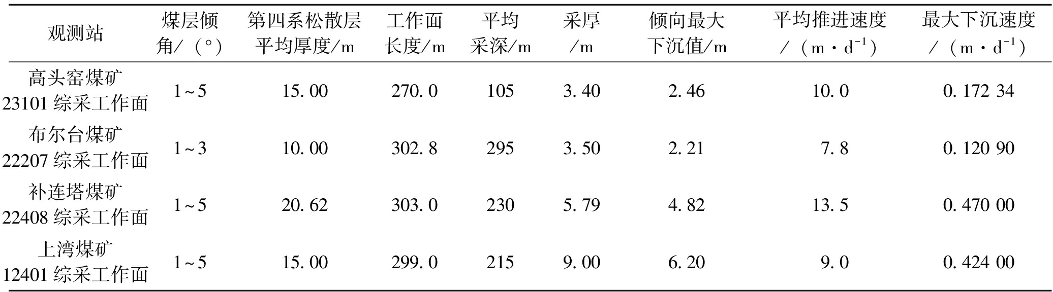 ★ 生态矿山 ★ 东胜煤田典型煤矿开采沉陷变形破坏研究井工煤矿在充分采动情况下,随着综采工作面的不断推进,地表移动是一个由缓慢、剧烈、逐渐恢复直至停止的过程[1-5]。采动地表移动变形预测的传统方法是待地表稳定后进行终态预测,随着研究的不断深入以及认识水平的逐步提高,研究人员逐渐意识到地表移动变形是一个复杂的时空变形过程[6]。在开采沉陷研究过程中,实现动态预测能够较好地实现采动过程中建(构)筑物的变形及破坏评价。地表动态移动沉陷受松散层厚度、覆岩性质、沉陷阶段等诸多因素影响[7-9],为了实现对地表建(构)筑物的有效保护,基于采动地表移动规律,结合东胜煤田典型煤矿岩移观测台账,分析总结了东胜煤田地表岩移规律,为进一步研究提供基础参考。 1 基本地质条件东胜煤田是以三叠系上统延长组为沉积基底的侏罗纪早期和中期含煤建造,主要含煤地层为侏罗系中下统延安组(J1-2y)。上覆地层有侏罗系中统直罗组(J2z)、安定组(J2a)、侏罗系上统~白垩系下统志丹群(J3-K1)、新近系上新统(N2)和第四系(Q)。 地层含煤组为2、3、4、5、6、7这6个煤组,其可采煤层厚度为1.63~28.60 m,各煤层与下覆地层为平行、不整合接触,地处鄂尔多斯台向斜的东北缘、次级构造单元——伊盟隆起东部。鄂尔多斯台向斜轮廓近长方形,呈极开阔的不对称单斜构造,向斜轴部偏西,西翼较陡,东翼宽缓。台向斜内部地质构造呈现简单,褶曲、断裂不发育,台向斜西翼构造呈现复杂,发育有巨大的倾伏倒转褶曲和逆掩断层 [10]。基本构造形态为单斜构造,向南西倾斜,倾角为1°~5°。东胜煤田南部地下水相对比较富集,北部和东部相对贫乏。东胜煤田区域性排泄带位于无定河中下游地带。水文地质勘探类型以裂隙充水矿床为主,水文地质条件简单[11]。 2 典型煤矿选取本次研究选取东胜煤田典型煤矿作为研究对象,采煤方法为走向长壁式采煤法,顶板管理均采用全部垮落法。各矿地表动态移动特征参数见表1。 表1 典型煤矿地表动态移动特征参数