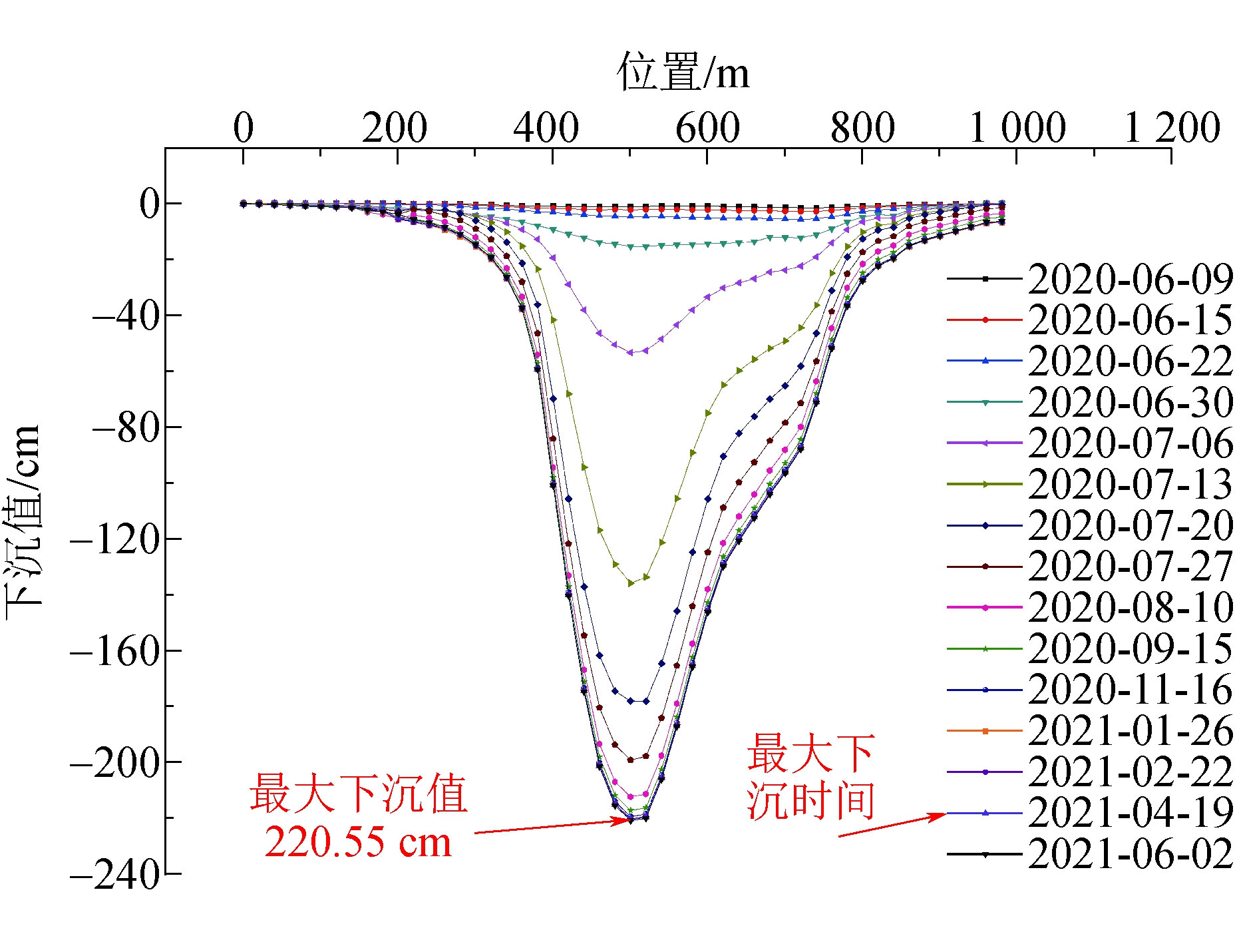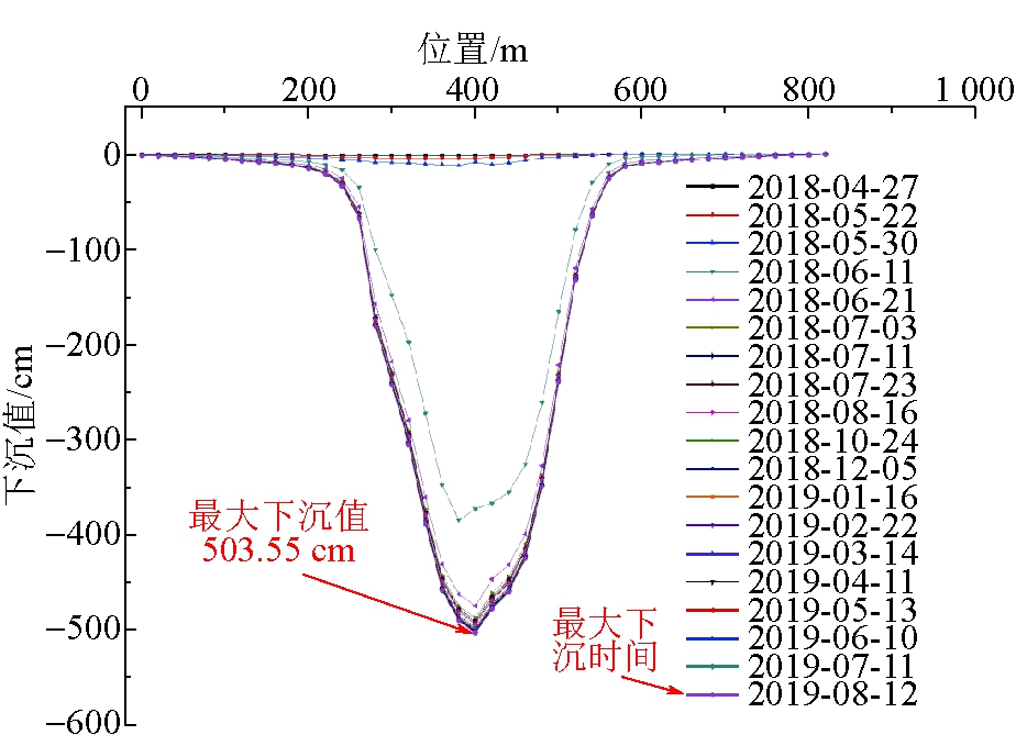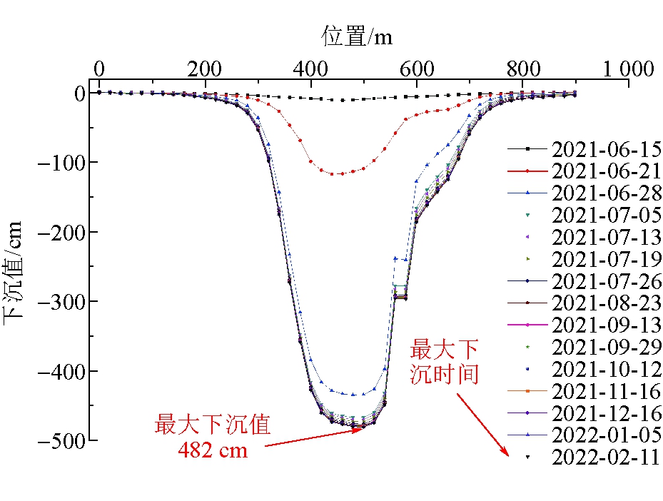 图3 布尔台煤矿22207综采工作面沿倾向下沉曲线 从图2~图5可以看出,在达到充分开采的情况下,综采工作面倾向方向从开切眼位置到停采处逐渐发生下沉,地表下沉影响范围以综采工作面中心线为轴向两边扩展,且范围大于综采工作面宽度。随着综采工作面的不断推进,地表下沉逐渐呈现“凹”形盆地状,最大值下沉发生在综采工作面中心线位置处;地表下沉从综采工作面中心线位置逐渐向两边减小,综采工作面边界位置下沉盆地相比陡峭,下沉盆地边界收敛慢。地表移动最大下沉速度反映地表移动的剧烈程度,主要和采深、采厚及覆岩岩性等有关,并且呈现出采深越大,最大下沉速度越小;采厚越大,最大下沉速度越大等规律[12-15]。