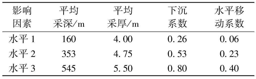 影响因素平均采深/m平均采厚/m下沉系数水平移动系数水平11604.000.260.06水平23534.750.530.23水平35455.500.800.40 表3 东胜煤田典型煤矿开采沉陷概率积分正交模型