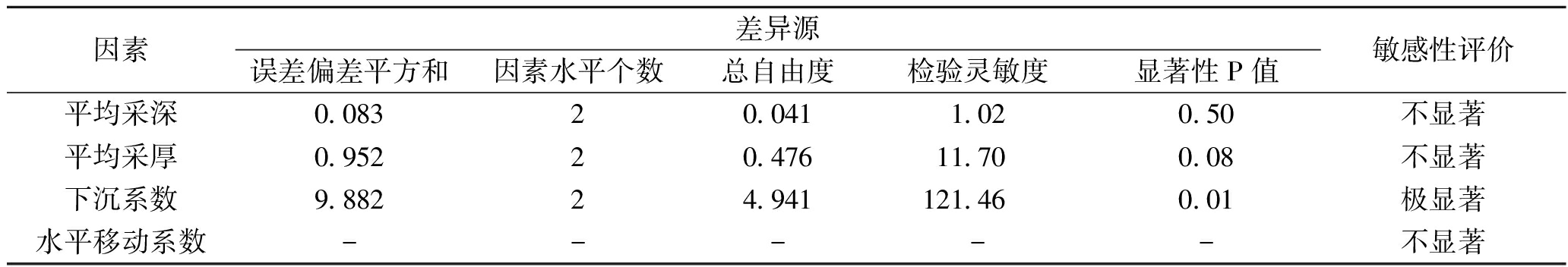 图10 各因素敏感性极差曲线 由图10中 “平均采深”因素敏感性极差曲线可知,随着平均采深在160、353和545 m这3个水平的逐层提高,平均采深在160~353 m范围内时,平均采深的极差和值与三水平数值的变化呈现负相关关系,之后平均采深在353~545 m范围内为水平线性,在该范围内极差和值无变化,整体趋势线呈现非线性响应规律。东胜煤田典型煤矿的平均采深在160 m时极差和值最小,平均采深在353 m和545 m时极差和值相当,以此为依据可计算平均采深因素的极差值,判断比较各因素的敏感性。 由图10 中“平均采厚”因素敏感性极差曲线可知,平均采厚的极差和值与三水平数值的变化呈现正相关关系,即随着因素水平值的增大,平均采厚的极差和值也逐渐增大。且曲线前后变化斜率相似,近似为一条直线,平均采厚在4.00~4.75 m范围内平均采厚增长的幅度近似等同于平均采厚在4.75~5.50 m范围内的极差和值,趋势线呈现线性响应规律。 由图10 中下沉系数因素敏感性极差曲线可知,下沉系数的极差和值与三水平数值的变化呈现正相关关系,即随着因素水平值的增大,下沉系数的极差和值也逐渐增大。且曲线前后变化斜率相似,近似为一条直线,下沉系数在0.26~0.53 m范围内平均采厚增长的幅度近似等同于平均采厚在0.53~0.80 m 范围内的极差和值,趋势线呈现线性响应规律。 由图10 中水平移动系数因素敏感性极差曲线可知,水平移动系数的极差和值与三水平的变化先呈现负相关关系后呈现正相关关系,趋势线呈现出非线性变化规律。随着水平移动系数在0.06、0.23和0.40这3个水平的逐层提高,其相应的极差和值先减小再增大。极差和值最大值出现在水平移动系数为0.06位置处,极差和值最小值出现在水平移动系数为0.23位置处。 3.3.2 预测数据方差分析 通过对东胜煤田典型煤矿开采沉陷地表移动规律的正交试验分析结果,利用Minitab数值模拟软件对正交试验涉及的9组试验结果和四因素三水平试验进行了方差分析,通过对方差分析中参数值的选定得到各因素敏感性显著效果,见表6。 表6 东胜煤田典型煤矿开采沉陷概率积分各因素方差显著性分析