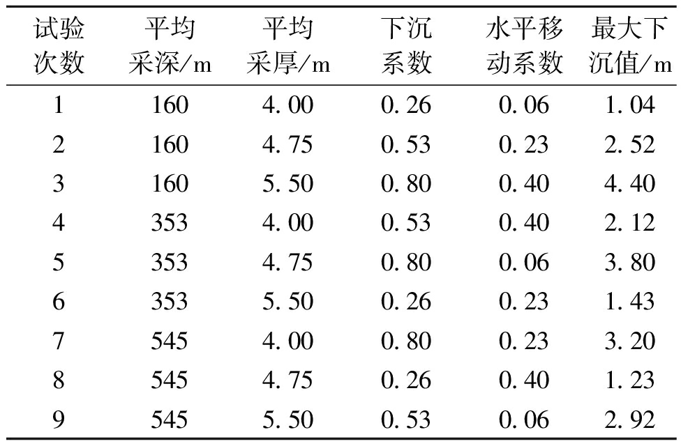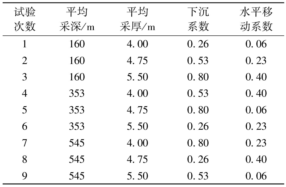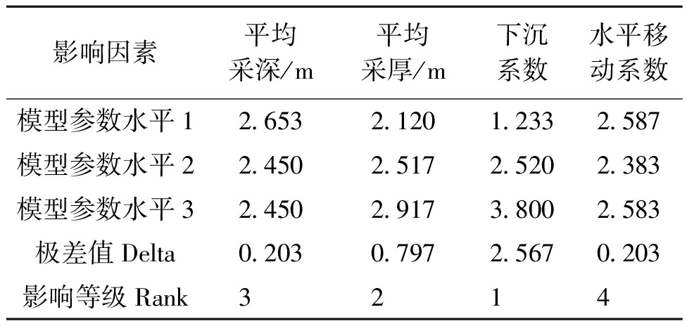 试验次数平均采深/m平均采厚/m下沉系数水平移动系数11604.000.260.0621604.750.530.2331605.500.800.4043534.000.530.4053534.750.800.0663535.500.260.2375454.000.800.2385454.750.260.4095455.500.530.06 表4 东胜煤田典型煤矿开采沉陷预测正交试验结果统计