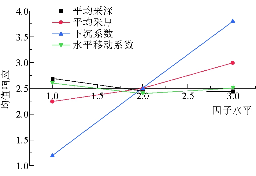 试验次数平均采深/m平均采厚/m下沉系数水平移动系数最大下沉值/m11604.000.260.061.0421604.750.530.232.5231605.500.800.404.4043534.000.530.402.1253534.750.800.063.8063535.500.260.231.4375454.000.800.233.2085454.750.260.401.2395455.500.530.062.92 3.3.1 地表变形响应规律分析 在东胜煤田典型煤矿正交试验结果统计的基础上计算出每个因素同一水平的全部试验结果之和,每个水平进行3次试验,求出该水平3次试验结果的平均值,对表4中的试验结果进行极差分析,分析结果见表5,各因素敏感性极差曲线如图10所示。 根据极差敏感性分析评价结果,各影响因素的极差敏感性等级定性排序为下沉系数>平均采厚>平均采深>水平移动系数。 表5 东胜煤田典型煤矿开采沉陷地表最大下沉值响应因素极差分析