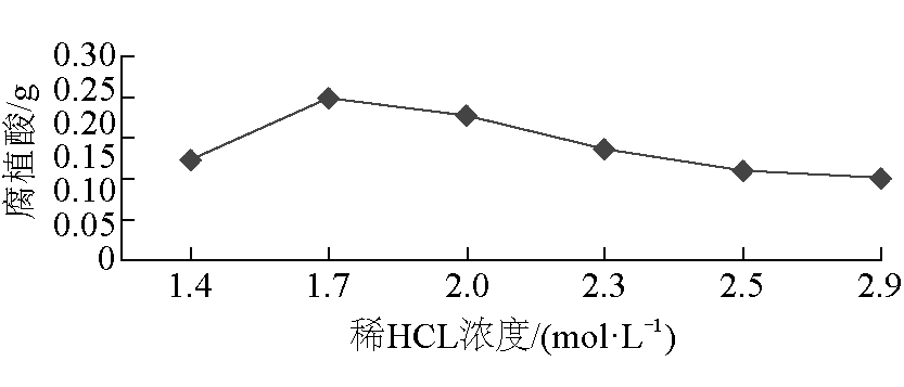 图7 固液比对腐植酸产量的影响 由图7可以看出,当固液比为2∶25时,腐植酸产量最大。但当配比超过2∶25时,随着溶液体积的增加,腐植酸产量有所下降,因此最优固液比为2∶25。 3.3 用稀HCl与NaOH提取腐植酸(1)稀HCl浓度选择。由于煤样本身的性质,稀HCl的浓度不宜过高,否则会影响腐植酸的质量。稀HCl浓度对腐植酸产量的影响如图8所示。 由图8可以看出,稀HCl的浓度为1.7 mol/L时,腐植酸的产量是最高的。随着稀HCl浓度的上升,腐植酸的产量下降,即黄腐酸的产量下降,分离效果不明显。