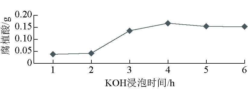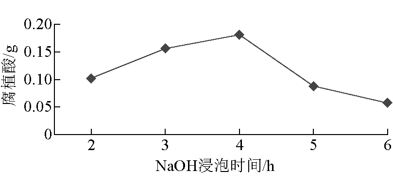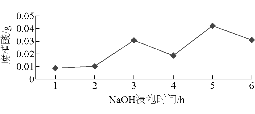 图5 稀H2SO4浸泡时间对腐植酸产量的影响 (4)NaOH浸泡时间选择。NaOH浸泡时间对腐植酸产量的影响如图6所示。